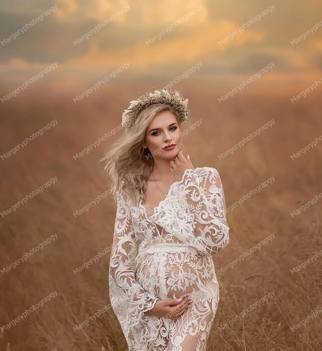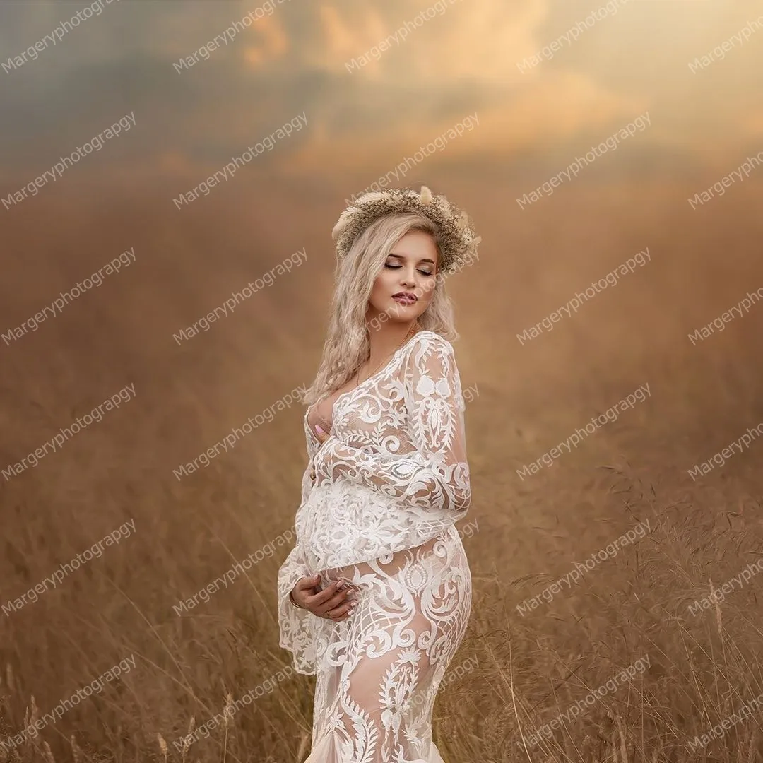 Кружевное платье с юбкой-годе для невесты, женское платье с длинными расклешенными рукавами и V-образным вырезом, элегантное фатиновое платье для беременных, платья для фотосъемки Flo