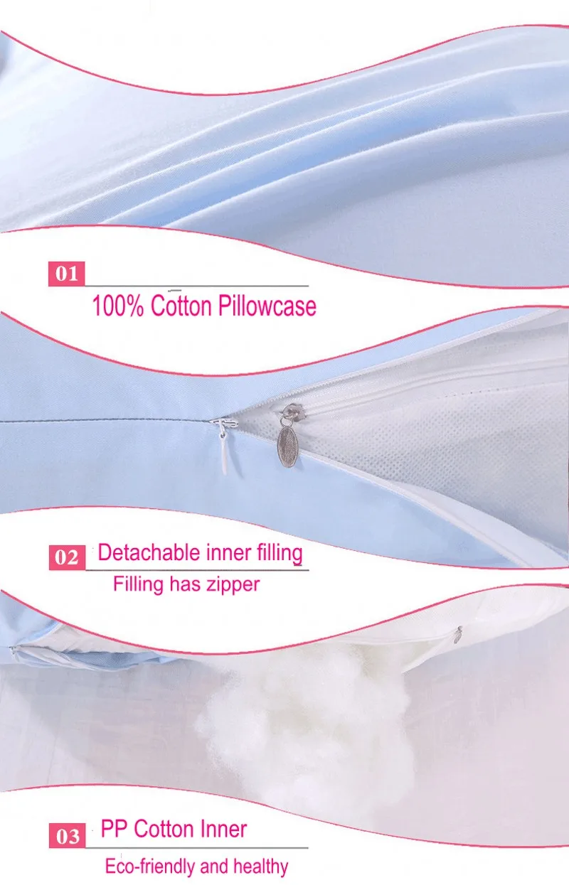 Цвет наволочек: белый, фиолетовый, розовый, синий, зеленый, верблюжийНаполнитель: 100% полиэфирное волокноКласс: класс АНаволочки: 100% хлопок, бархат.Наволочка: хлопок с жемчугомЧасть: боди, голова, талияТип узора: рисунок с героями мультфильмов, однотонный рисунок.Форма: u-образныйВес: 1,3 кгХарактеристики: антистатический, охлаждающий, анти-храп