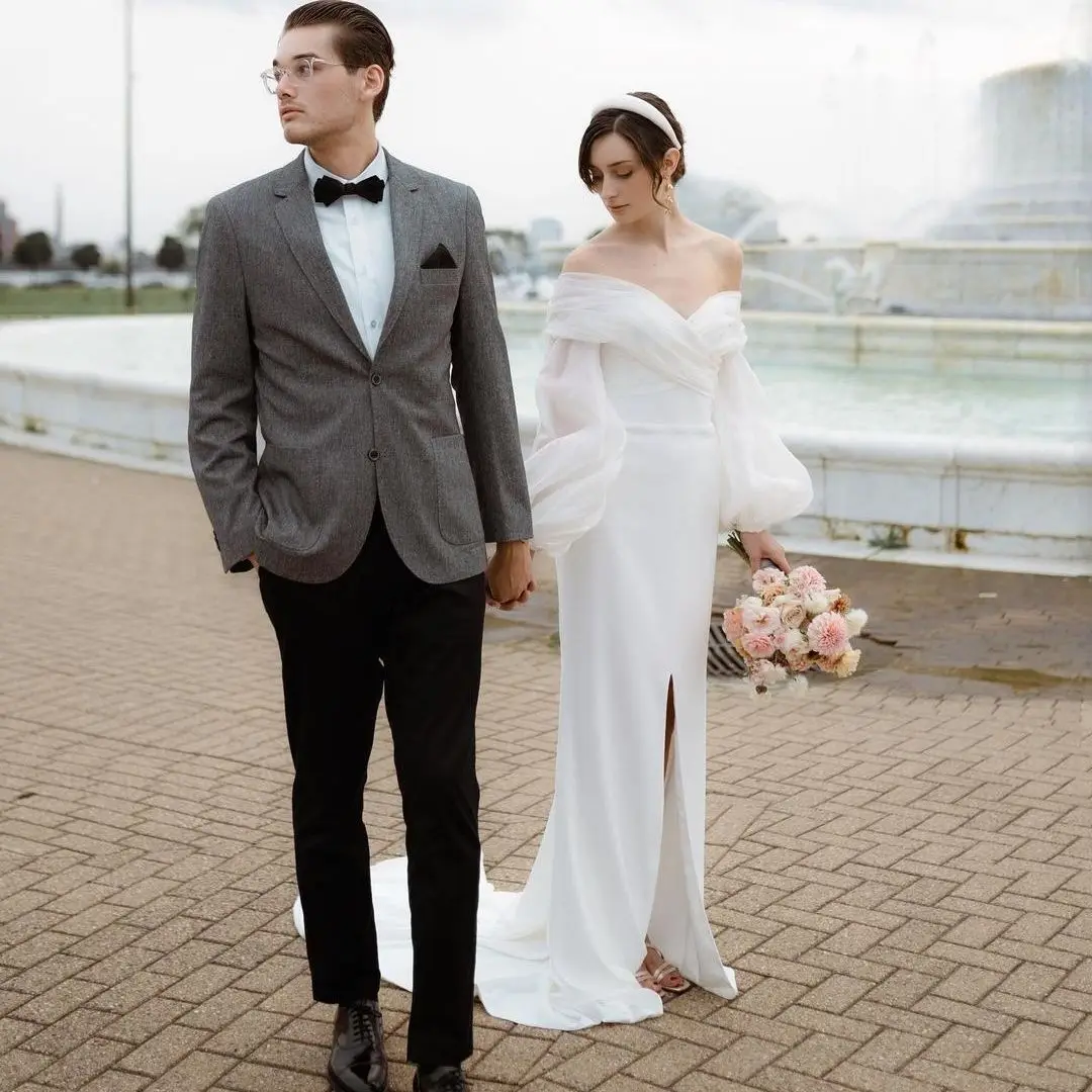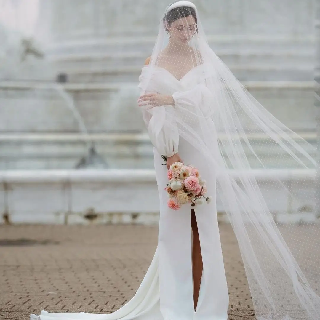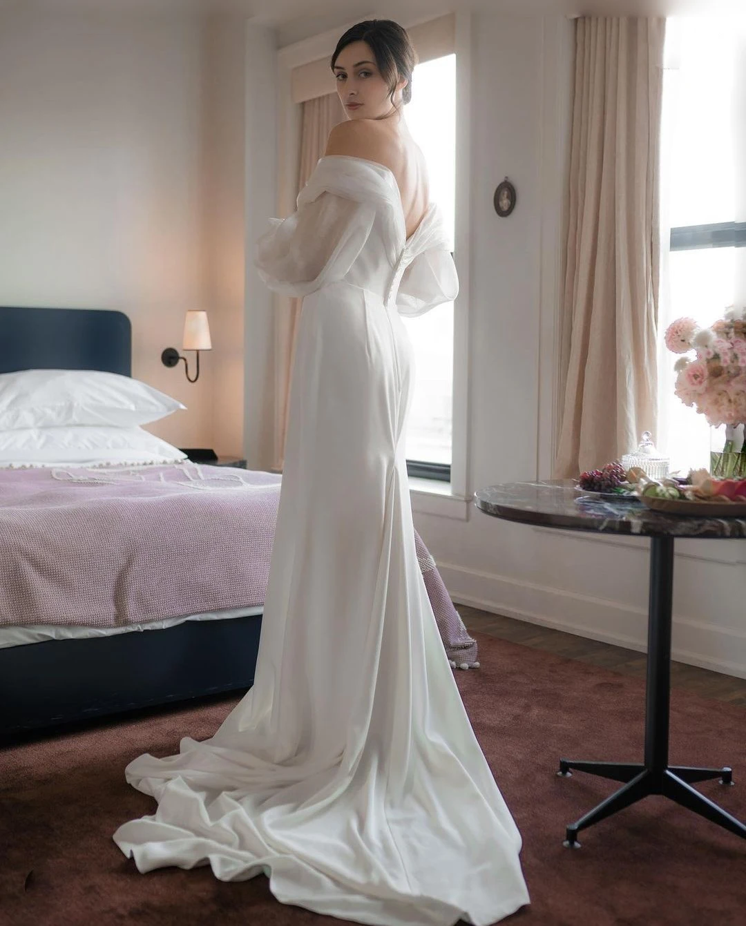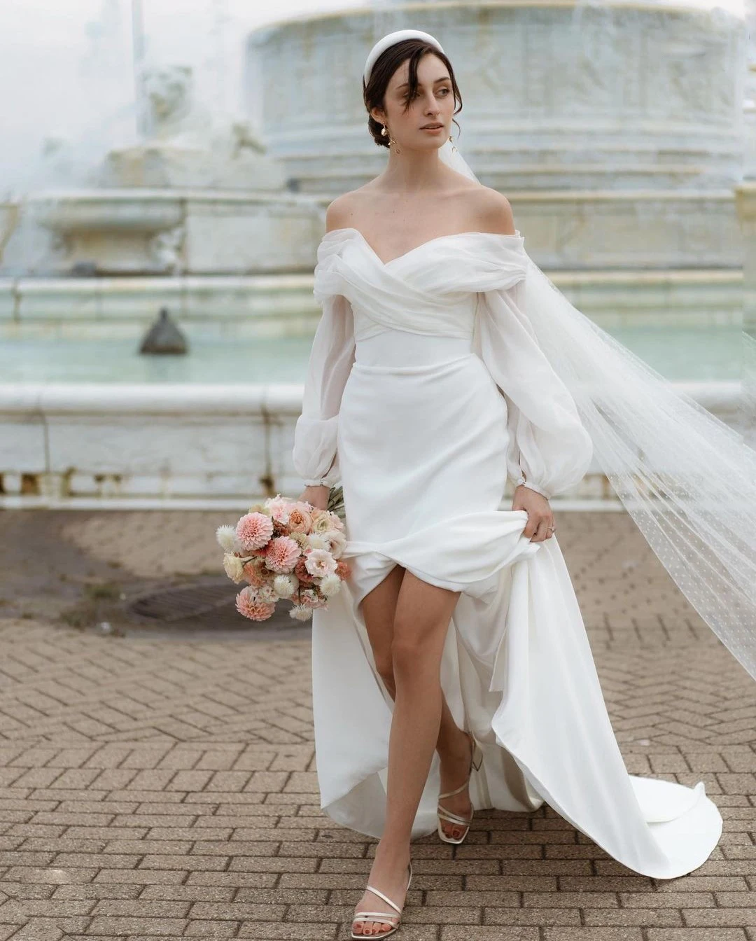 Элегантные атласные свадебные платья с пышными длинными рукавами 2021 свадебное платье с открытыми плечами со шлейфом Свадебное платье с разрезом сердечком свадебное платье