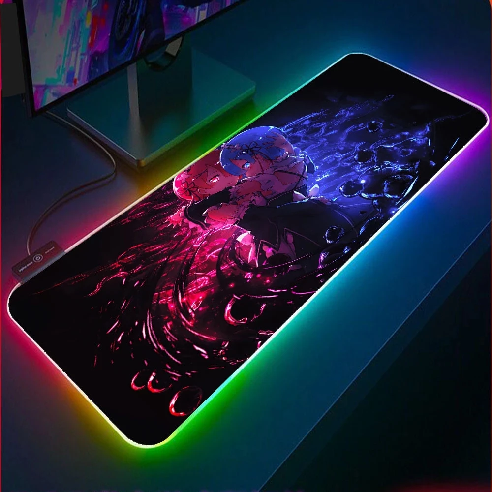 Игровой коврик для мыши с рисунком аниме Re Zero Two RGB, игровые аксессуары XXL, Настольный коврик для мыши со светодиодной подсветкой, нескользящий коврик для клавиатуры, Настольный коврик