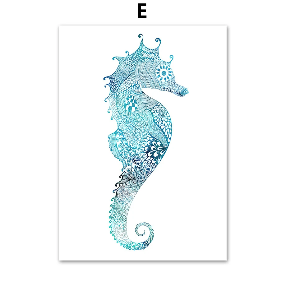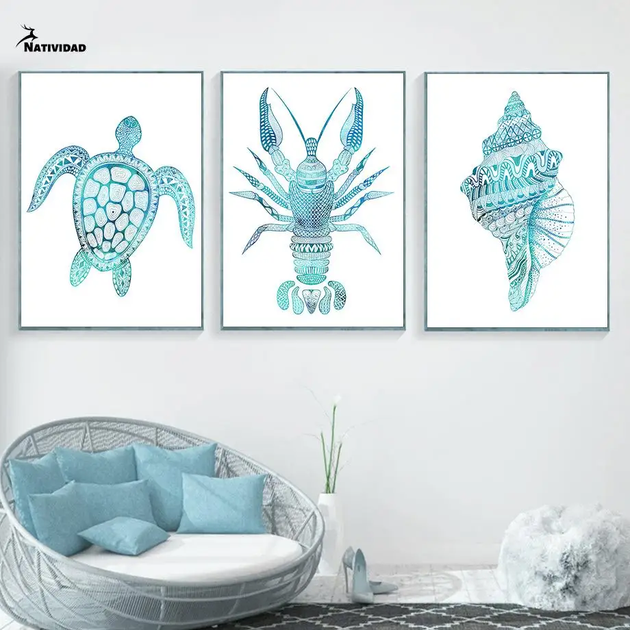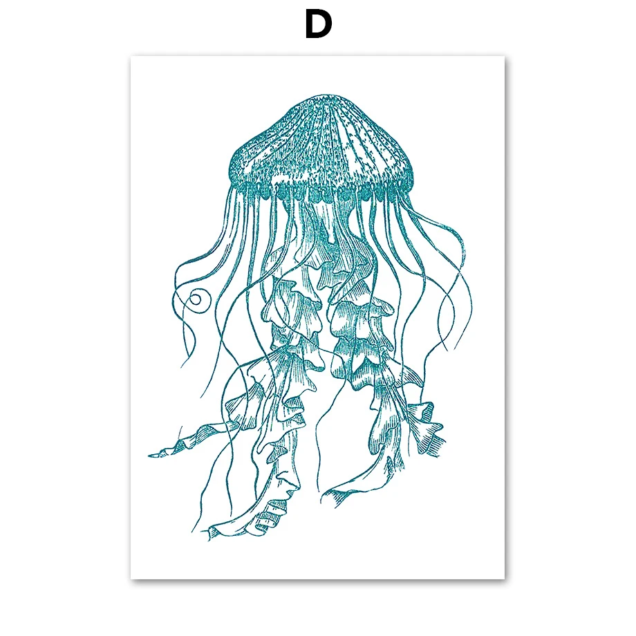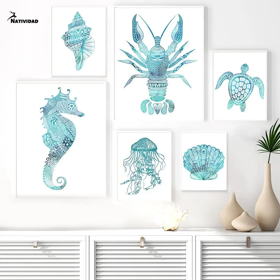 Постеры и принты морской жизни, Омар, морская лошадь, ракушка, медуза, винтажная Картина на холсте, стена для гостиной, домашний декор