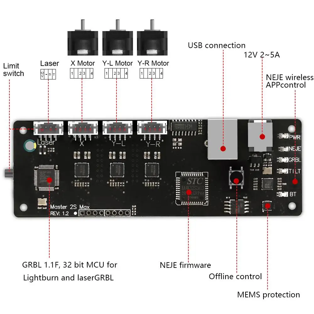 Маркировочный гравировальный станок для резки принтер лазерный гравер фрезерный станок с ЧПУ мастер 2s с 32 битМодель: Master 2S max A40630/A40640Площадь гравировки и резки: 460x810 ммМатериал радиатора: авиационный алюминий + латунный корпусСветящийся цвет: синийРазмер сечения: 40 мм x 40 ммРежим охлаждения: Интеллектуальный контроль датчика температуры + вентилятор охлаждения 10000 об/мин 40 ммРазмер: 60*40*40 ммРазъем адаптера: 5,5 2,1 портМожет выгравировать: МДФ/балса/бумага/дерево/ткань/пластик/кожа/Фанера/акрилия/доска ABS/лист ПВХ/PPR/PCBA/бакелит/углеродное волокно/металл краски/анодированный алюминий/нержавеющая сталь стальМожно разрезать: MDF/Balsa/бумага/дерево/ткань/пластик/кожа/Фанера/нетканые/хлопок/лен/бархат/холст/акрил/ABS доска/ПВХ лист/EPE/KT доскаОптическая Выходная мощность: FAC 5,5 Вт/10 ВтДлина волны: 455-450нмРабочее напряжение: 12 В постоянного токаВходное напряжение: DC12V 4A