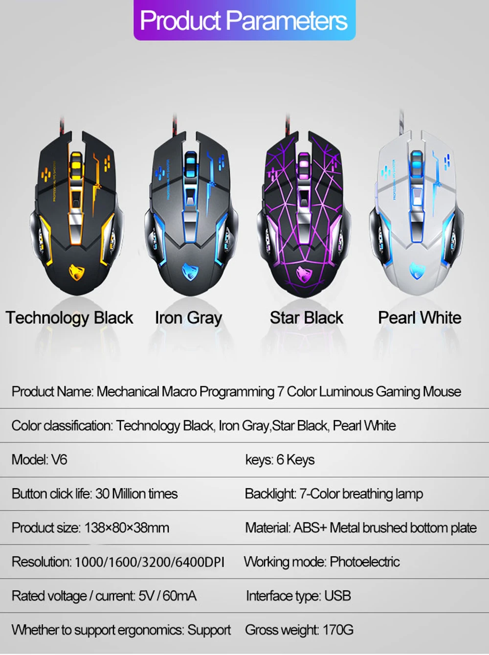 Параметры продуктаНазвание продукта: Механическая Макросъемка 7 цветов светящаяся игровая мышьРасцветка: черный, серый, черный, жемчужно-белыйМодель: V6Ключи: 6 клавишКнопка нажатия: 30 миллионов разПодсветка: 7-Цвет охлаждающаяся лампаРазмер изделия: 138x80x38ммМатериал: АБС + металлическая матовая Нижняя пластинаРазрешение. : 1000/1600/3200/6400DPI режим работы: фотоэлектрическийНоминальное напряжение/curent: 5 В/60 мАТип интерфейса: USBПоддержка эргономики: поддержка веса брутто: 170 г
