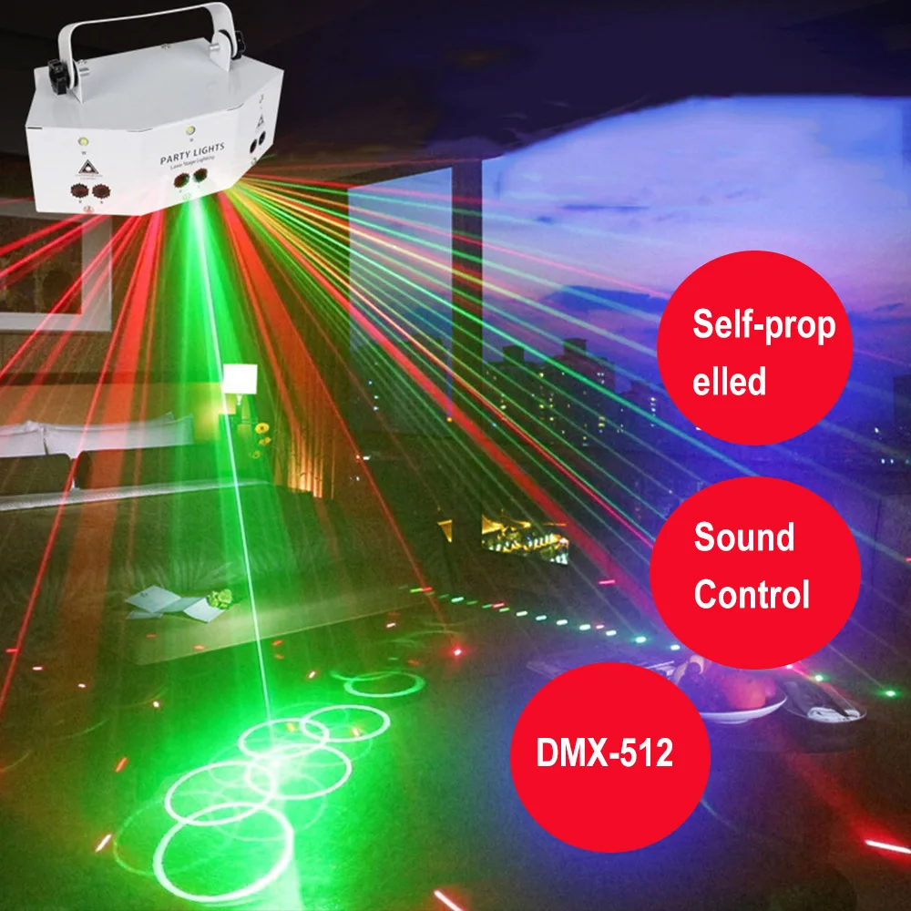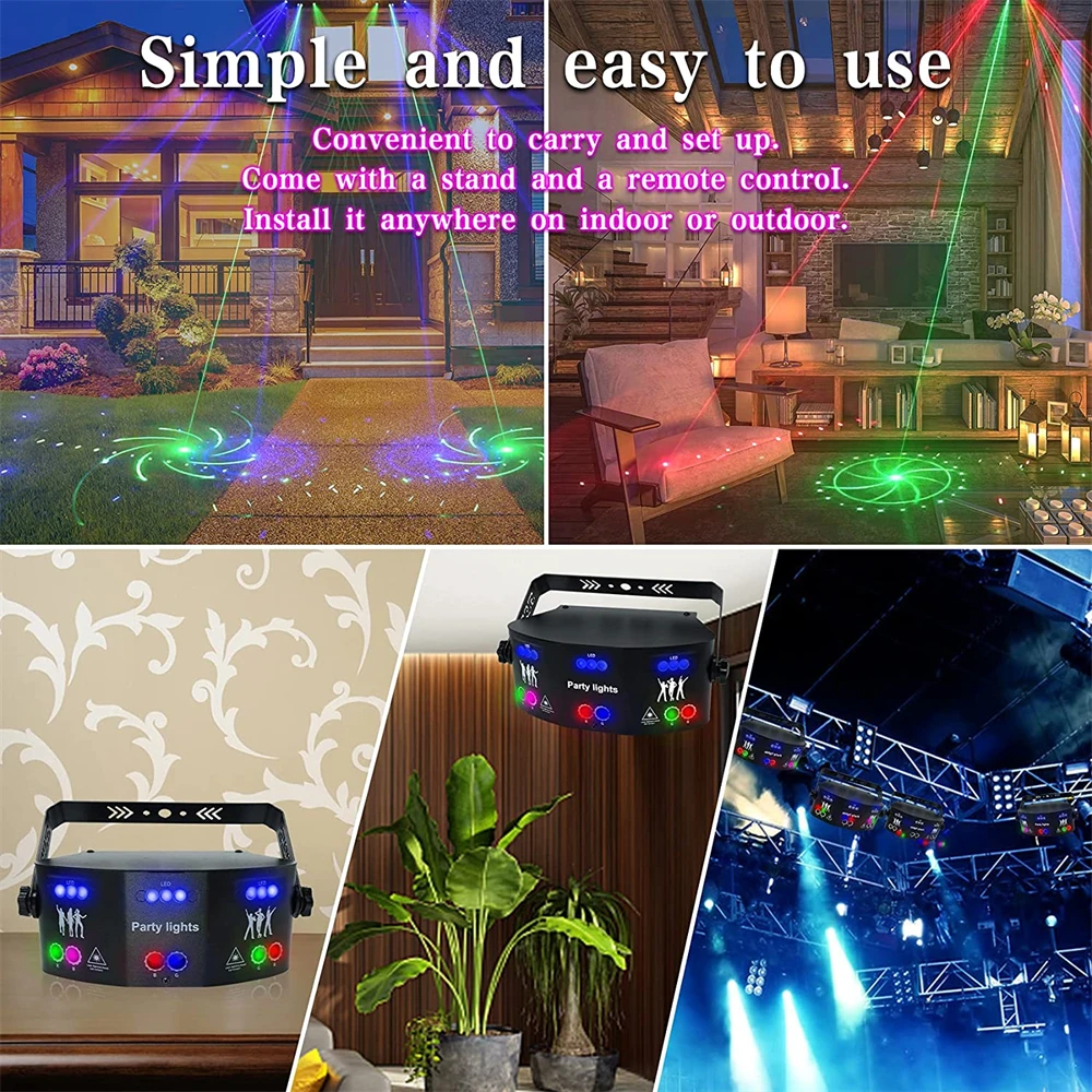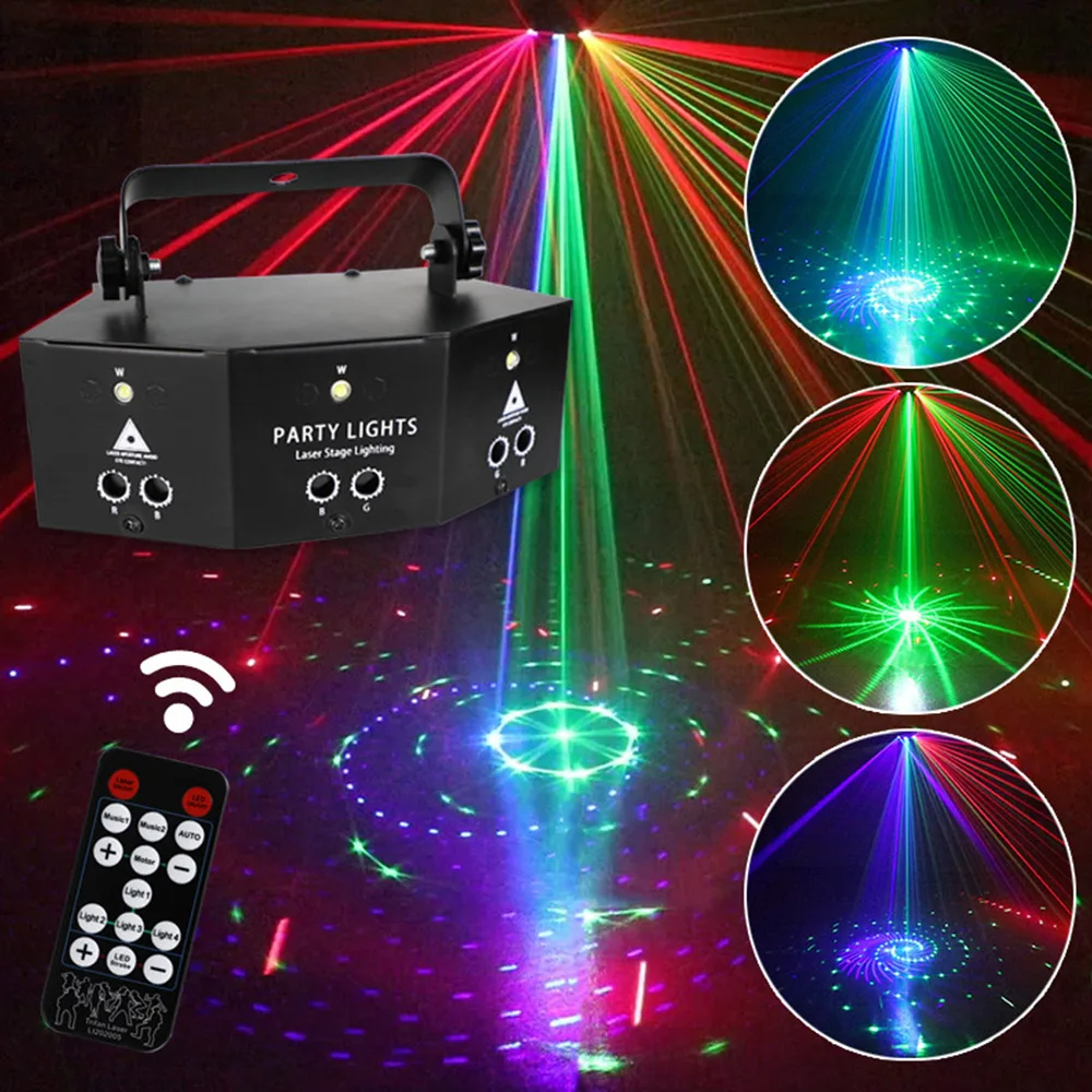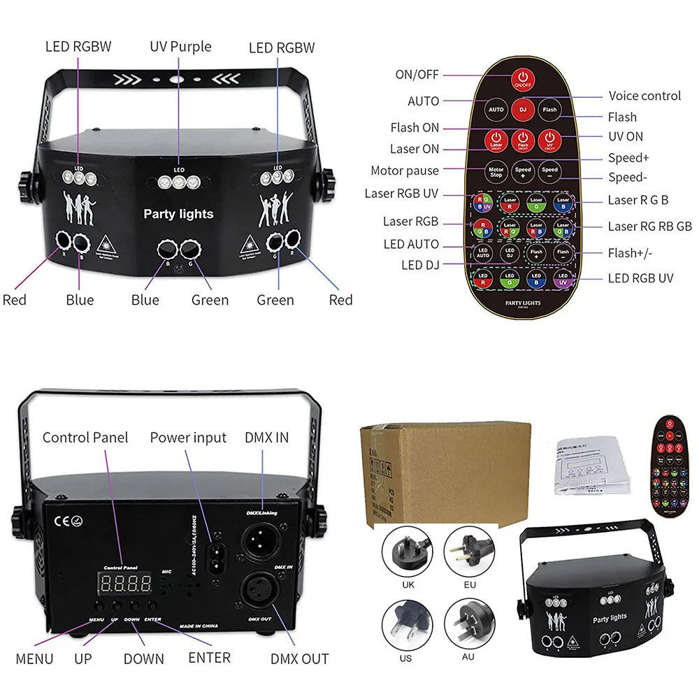 Характеристики производительности:1. Профессиональный вечерние светильник с цветовым эффектом: сочетание красного, синего, зеленого лазера и стробоскопа, цветового фона RGB для создания незабываемого лазерного шоу, что позволяет создавать потрясающие представления.2. Выбор режима работы: автоматический, пульт дистанционного управления, голосовое управление, DMX512, через датчик голосового управления, чтобы запечатлеть эффект звукового управления музыки и танец в ритме музыки.3. Не только сценические огни, но и семейные дискотеки и огни KTV. Украшение для дома. Подходит для освещения для жизни, клубов, баров, семей, свадеб, Хэллоуина, Рождества, праздников