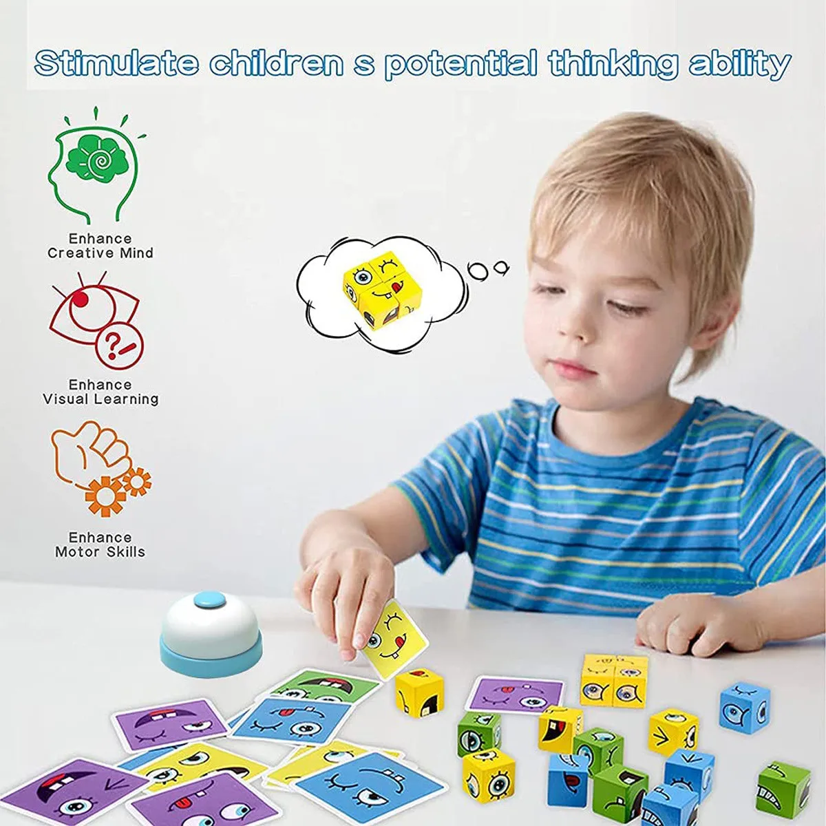 Деревянный Игрушки с выражениями Деревянный Магический Куб с рисунком лица строительные блоки образовательные Монтессори игрушки соответствующие блоки головоломки для детей, поставляются с 16 штук дереваЛобзики, Звонок и 64 карты