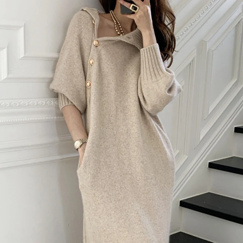 Трикотажное платье-свитер с высоким воротником, на пуговицах