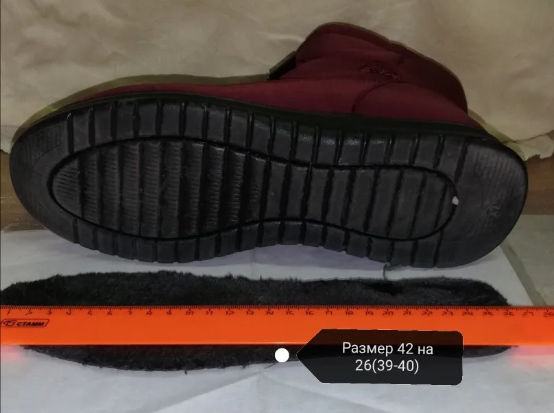 Ботинки огонь) Кому важен комфорт ,берите. Легенькие ,тепленькие,если ещё постелить натуральную стельку-цены им не будет) Утеплитель внутри, что то типа флиса, Поэтому,думаю стельку поменять на натуральное что то. На длину стопы 26, взяла 10.5 размер. То что надо. с теплым носочком будет самое оно.) Почти месяц в Белгородскую область,норм. Продавцу спасибо!