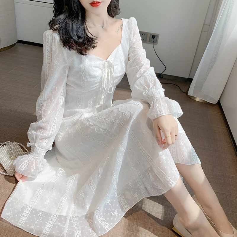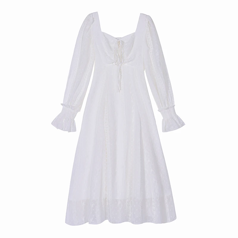Женское платье с длинным рукавом, белое кружевное платье средней длины с квадратным вырезом, поясом на завязках и принтом, осень 2021