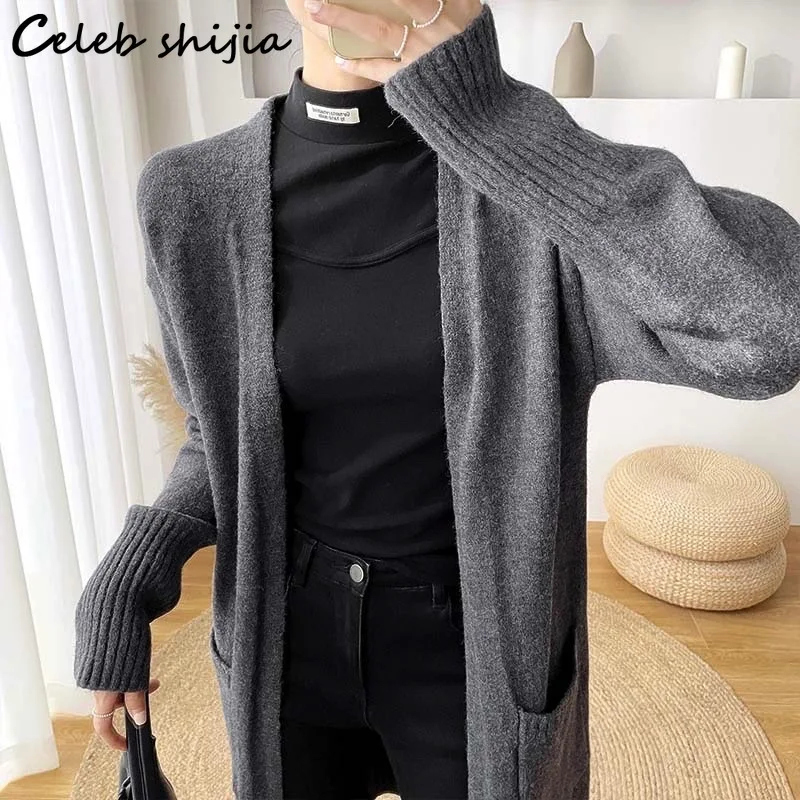Кардиган женский кашемировый, элегантный вязаный жакет с карманами и длинным рукавом, свободный свитер в Корейском стиле, шикарный серый, на осень