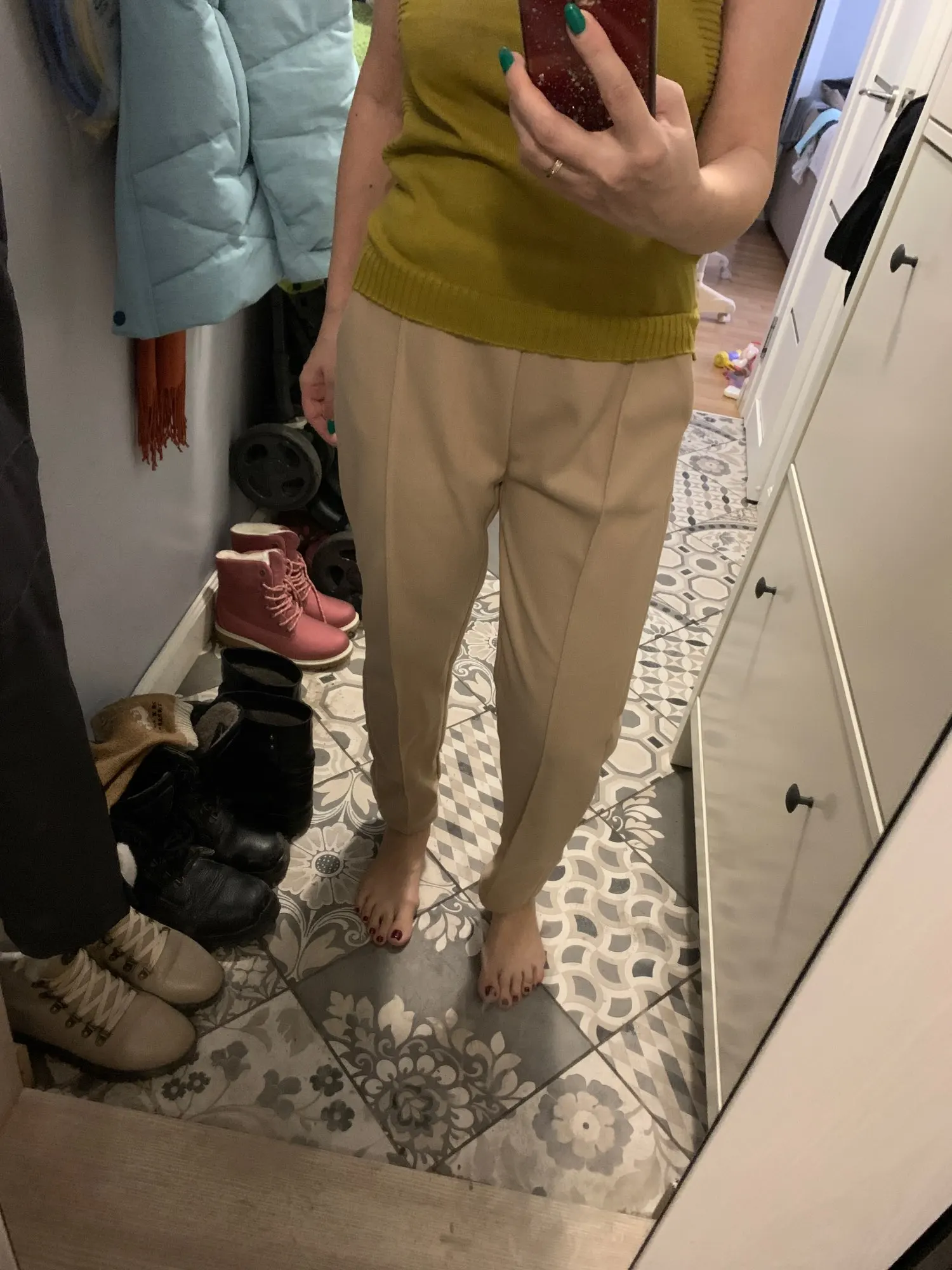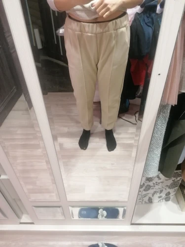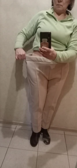 Заказала брюки во второй раз. Первые были бежевые и на размер меньше, классные в обтяжку, но не давят. Захотела чуть свободнее и чёрные. В итоге утонула! Разочарована. Но качество отличное. Доставлены быстро