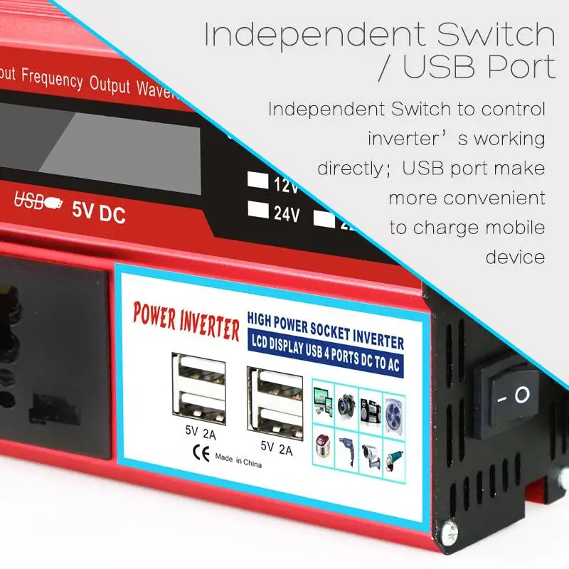 -Универсальная розетка-4 USB интерфейса-Цифровой дисплей-Умный размер, светильник, совместимость, отсутствие шума и загрязнения, техническое обслуживание-Применяется в автомобилях, морских, солнечных электростанциях/ветряных электростанциях, мотивных офисах, аварийных работах, переделках.-Эффективность до 80%. Супер емкость перенапряжения, чтобы начать трудную нагрузку.-Сильная адаптируемая и стабильная нагрузка.