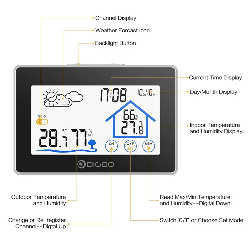 Беспроводная сенсорная Метеостанция Digoo DG-TH8380, комнатный и уличный датчик прогноза, термометр, гигрометр, метр, календарь, подсветка
