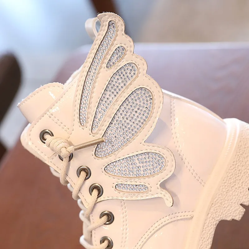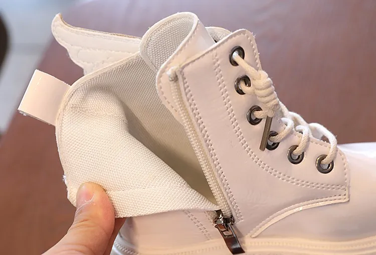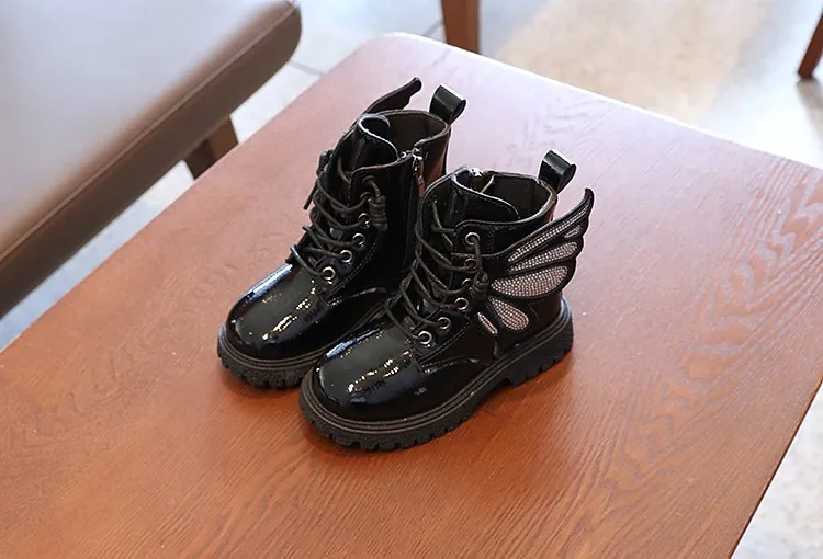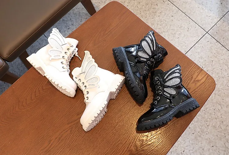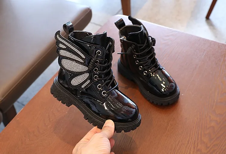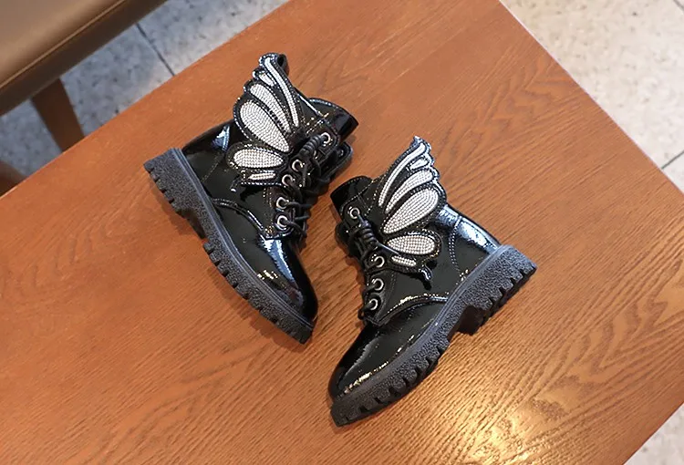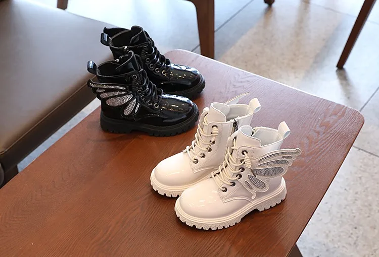 Детские Ботинки Martin, осенние ботинки для девочек из лакированной кожи со стразами и бабочками, черные, белые, на молнии, на платформе, 26-36 дюймов, детская обувь