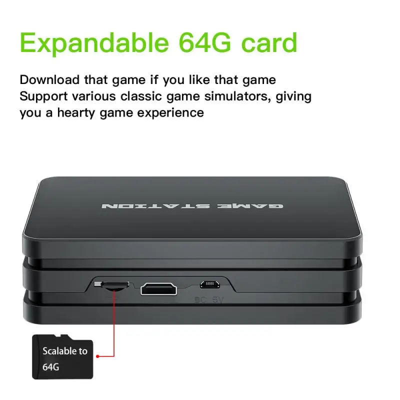 1 × игровая консоль, 2 × проводной игровой контроллер, 1 × HDMI-совместимый удлинитель, 1 × USB кабель для передачи данных, 1 × tf-карта (32G), 1 × Руководство пользователя