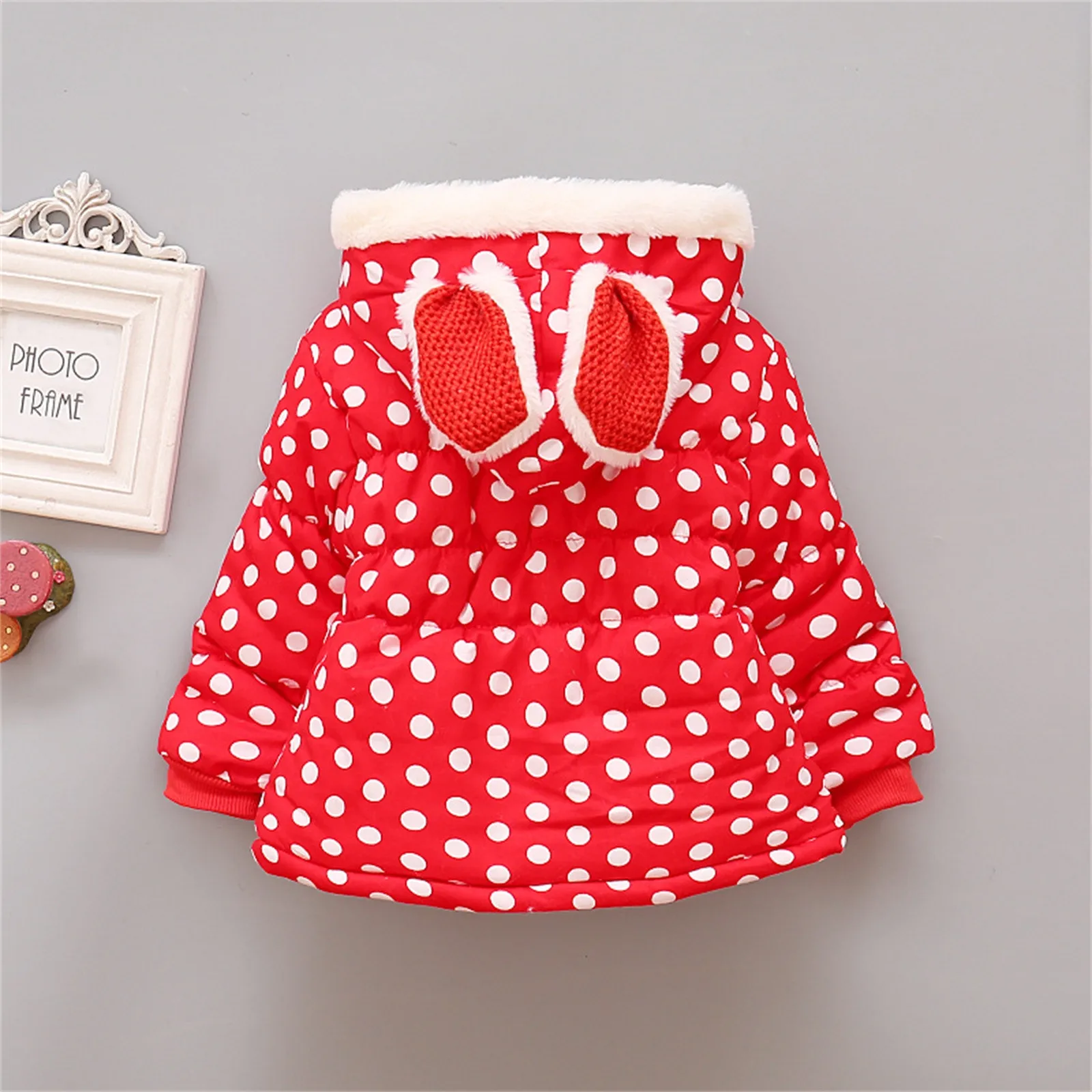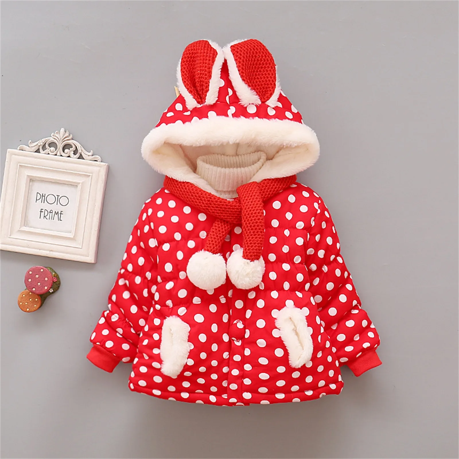 Новинка 2022 года, куртка в горошек для маленьких девочек и мальчиков, зимнее теплое ветрозащитное пальто с капюшоном с 3D ушками, верхняя одежда с шарфом, комплект одежды