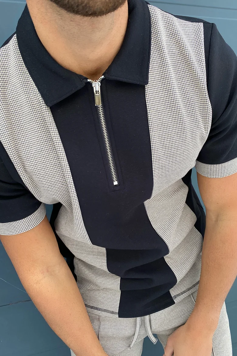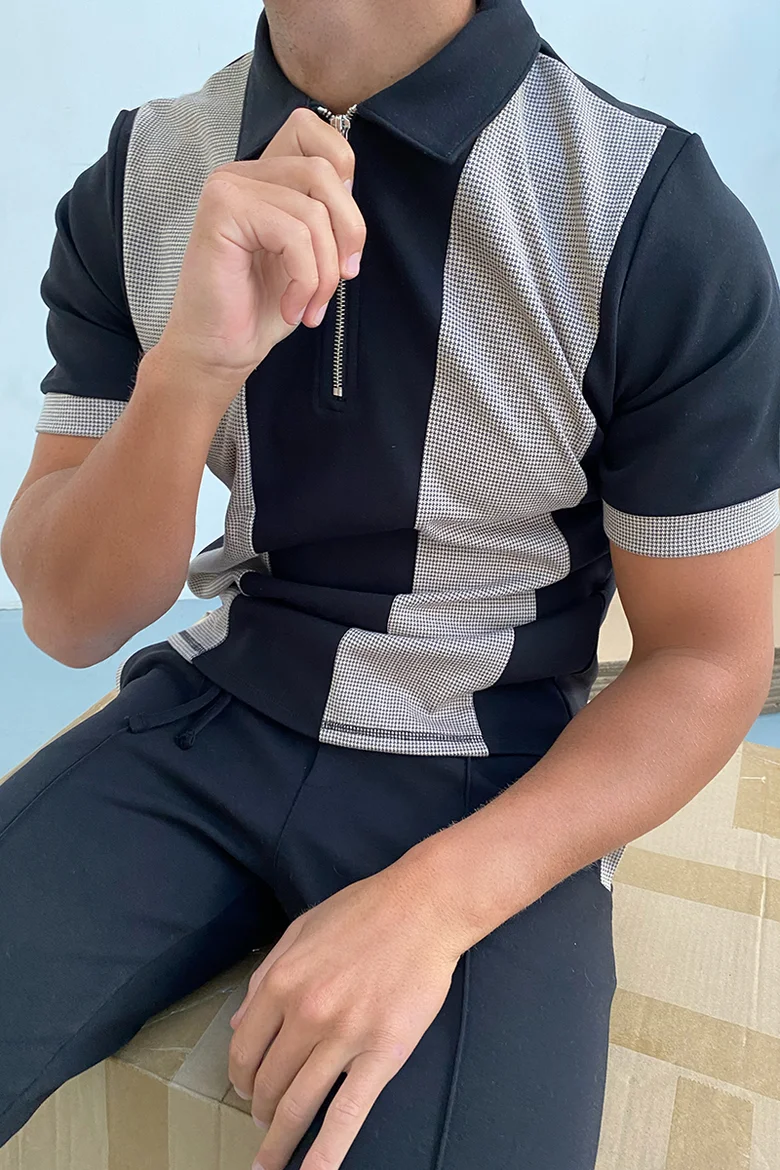 Мужская рубашка-поло в полоску, с отложным воротником и молнией, с коротким рукавом