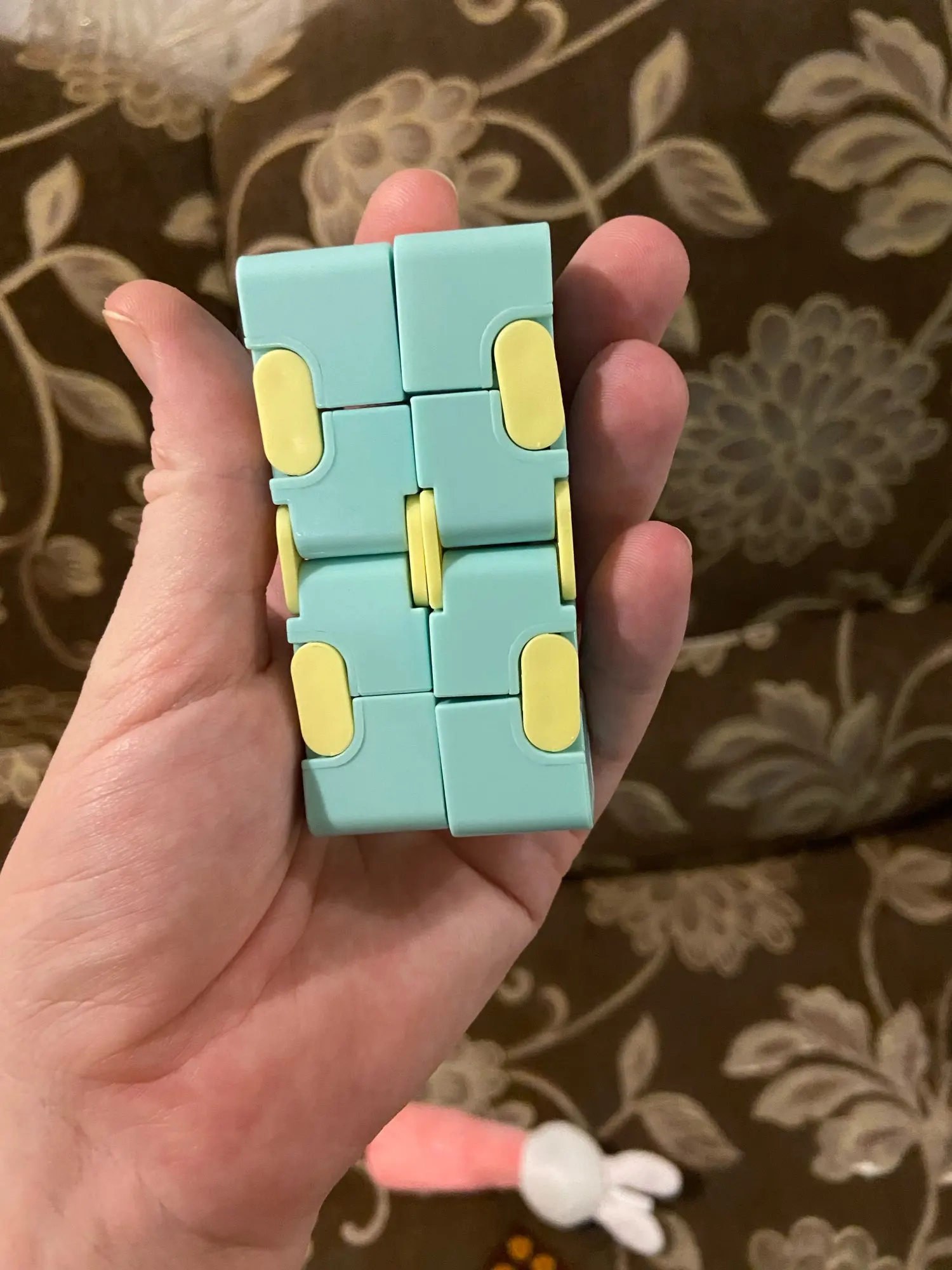 Игрушка приятная, небольшая, удобно умещается в ладони, лёгкая. Сочетание цветов (голубой и розовый) мне кажется приятным, не слишком яркое, мягкое. Единственная маленькая особенность - игрушка не беззвучная. Для любителей крутить в руках что-то постоянно важно, чтобы игрушка была тихой, так как это позволяет брать её с собой в общественные места. Этот кубик постукивает/пощёлкивает при переборе, что может раздражать окружающих или привлекать их внимание