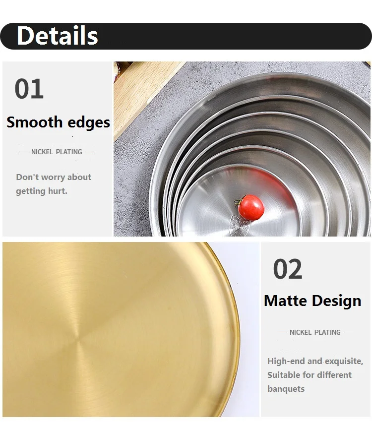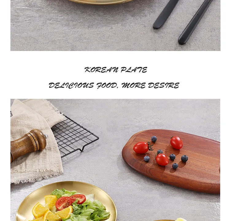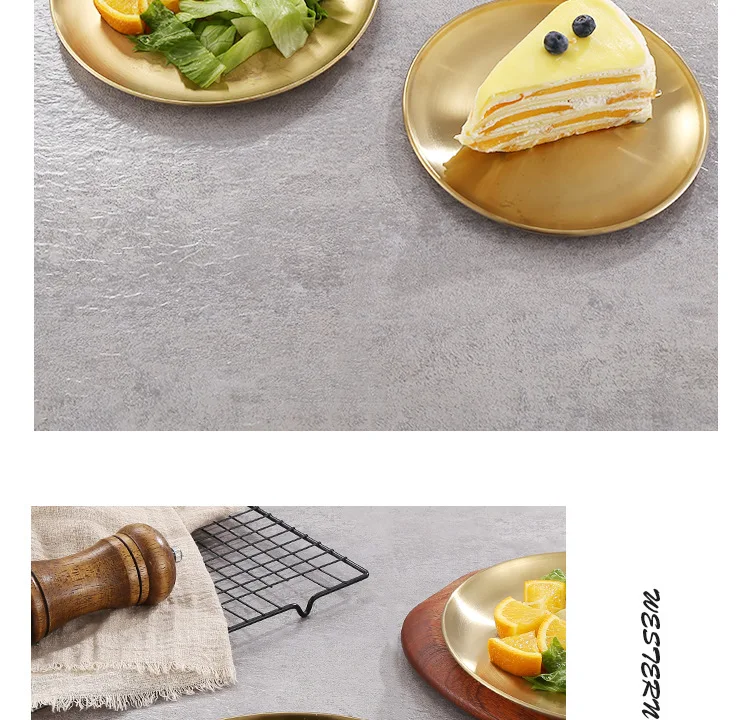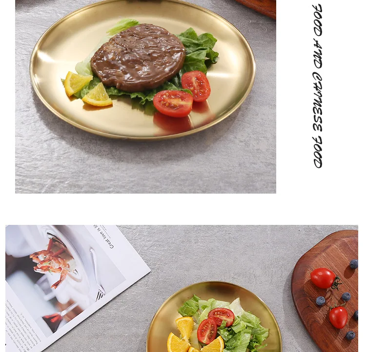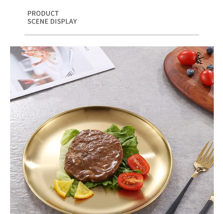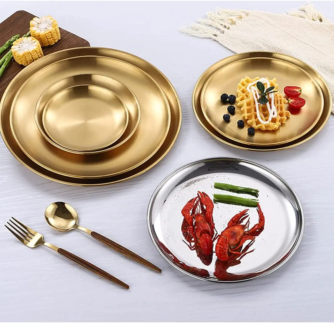 Круглая обеденная посуда, золотые тарелки из нержавеющей стали, металлические тарелки для пикника, искусственная утварь, кухонная посуда, небьющаяся