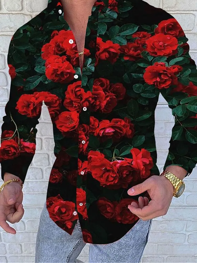 Рубашка мужская с длинным рукавом, Повседневная модная, с цветочным принтом и красным цветком, уличная одежда, осень