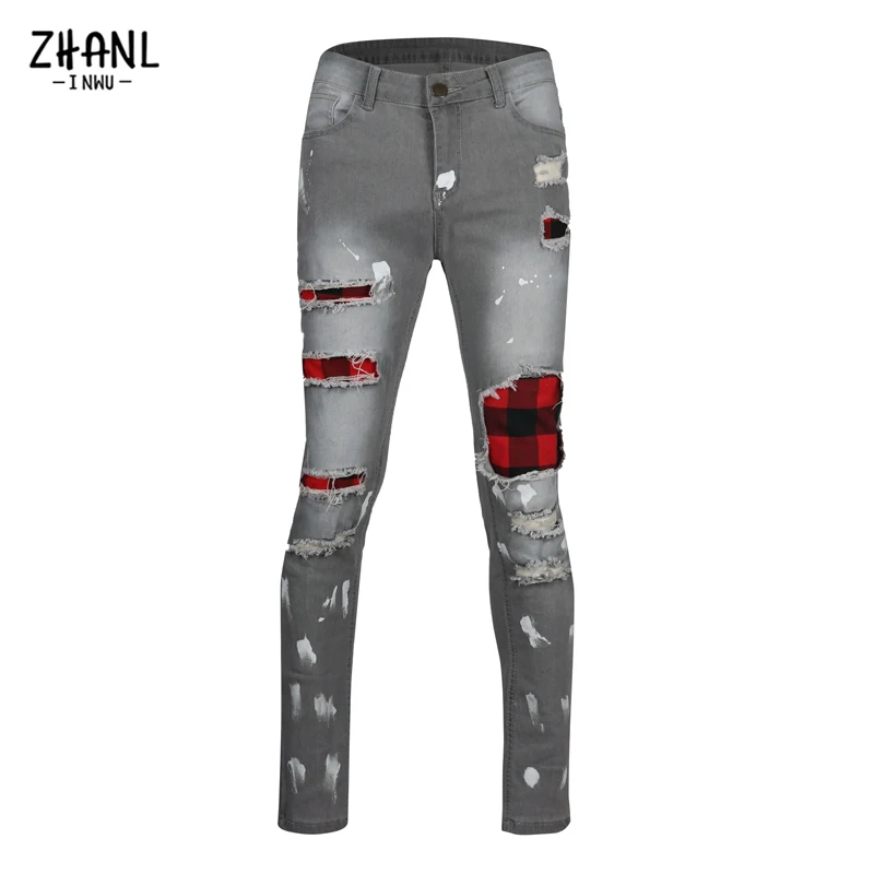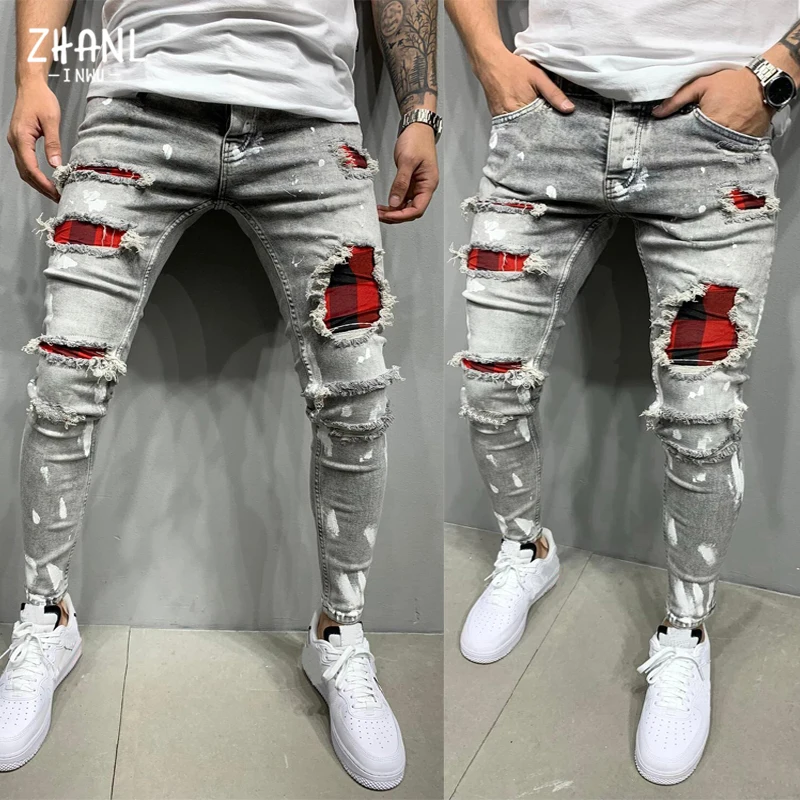 Джинсы-Карандаш мужские рваные, модные рваные узкие брюки-стрейч в стиле пэчворк, черные облегающие джинсы в клетку с рисунком, для бега