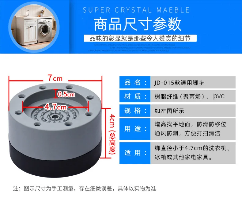 1. Изготовлен из высококачественного материала, прочный и долговечный. 2. Обеспечивает замечательную изоляцию звука и вибрации, обеспечивая бесшумное время стирки 3. Супер Сильная поглощающая способность вибрации делает вашу стиральную машину более Стабильная и сохраняет вашу прачечную аккуратной и красивой. 4. Многофункциональность: подходит для столов и стульев, диванов, стиральной машины, кровати, чайного стола и другой мебели для защиты ног. 5. Он может поднять высоту бытовой техники и мебели, чтобы защитить их от влаги, что делает уборку удобной.