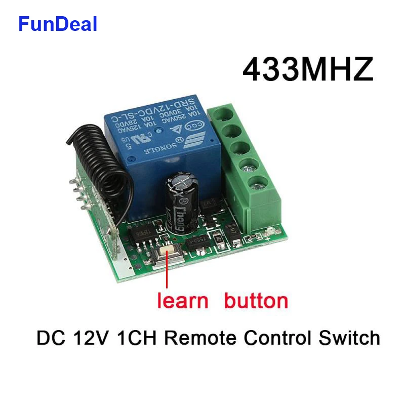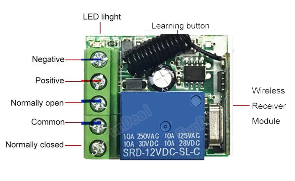 Изучение кода: (переключение)Нажмите кнопку обучения на приемнике дважды, он приходит в режим переключенияПодождите немного, светодиодный индикатор включится, он войдет в состояние обучения.Нажмите кнопку дистанционного управления, светодиодный индикатор на плате приемника будет мигать 3 раза, а затем выключаться,Обучение успешно.