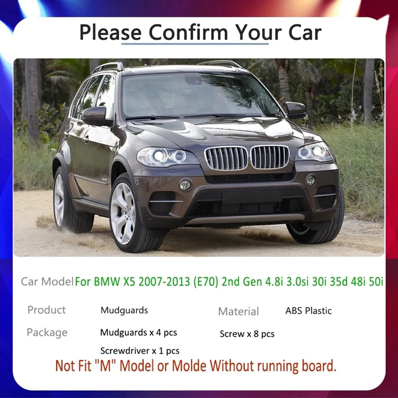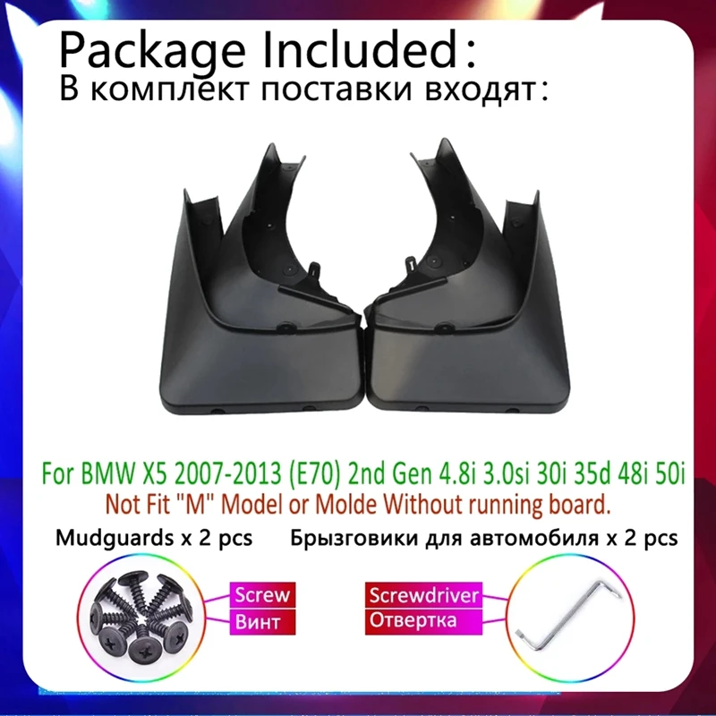 Для BMW X5 2007-2013 (E70) 2nd Gen 4.8i 3.0si 30i 35d 48i 50iИзготовлен из высококачественного пластика.Он используется для предотвращения грязной воды окрашивания вашего автомобиля в дождливый день или где-то в грязной дороге. Вы всегда чувствуете беспокойство, когда идет дождь? Вперед! Почему бы не купить его, чтобы сэкономить много драгоценного времени и энергии, чтобы беспокоиться об этом и часто мыть автомобиль.И он также прост в установке!Цвет: черныйМатериал: АБС-пластикПосылка:4 x брызговика (2 шт спереди + 2 шт справа)1 x инструмент для установкиТолько вышеуказанная посылка, другие товары не включены.Примечание: светильник и различные дисплеи могут привести к тому, что цвет товара на картинке немного отличается от реального. Допускается погрешность в измерениях +/- 1-3 см.