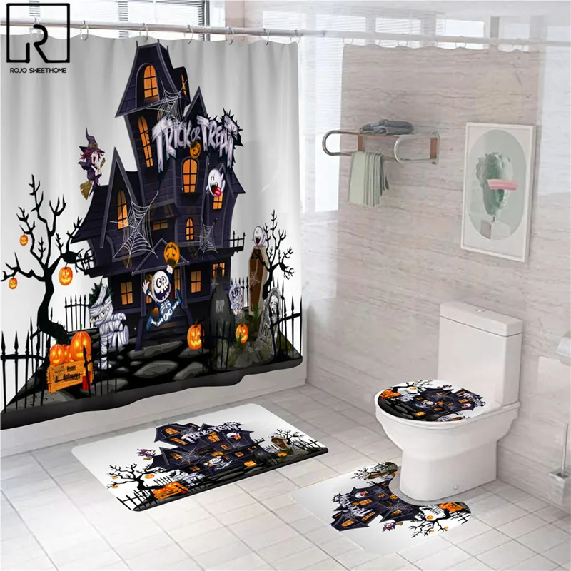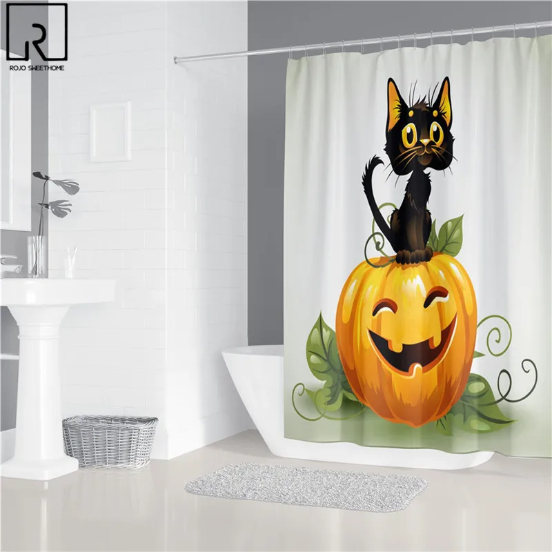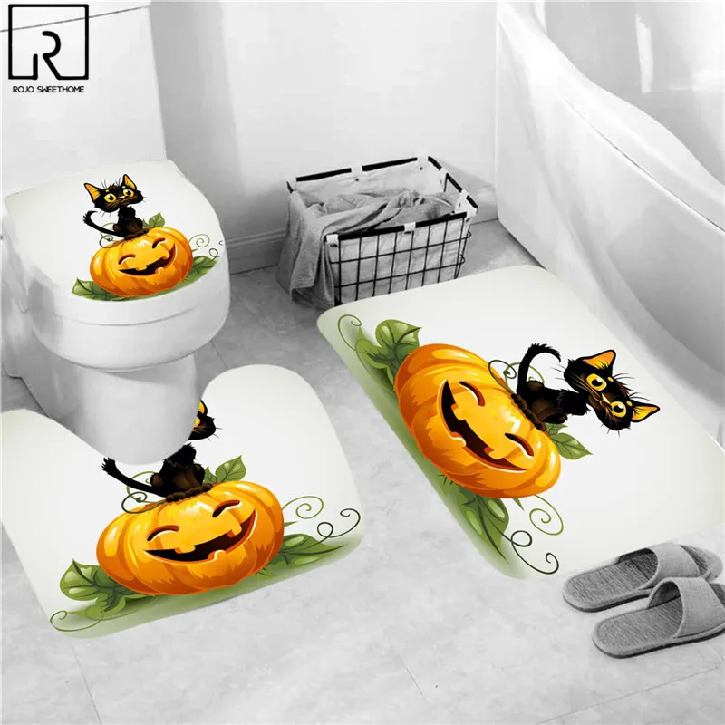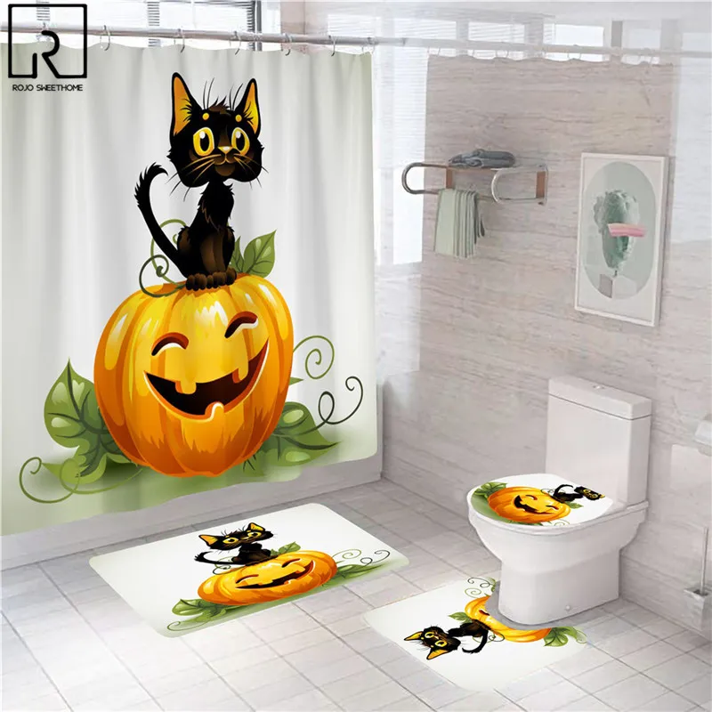 Занавеска для душа в виде кошки и тыквы на Хэллоуин, праздничное украшение для ванной комнаты, комплект мягких ковриков из полиэстера, ковриков, туалета