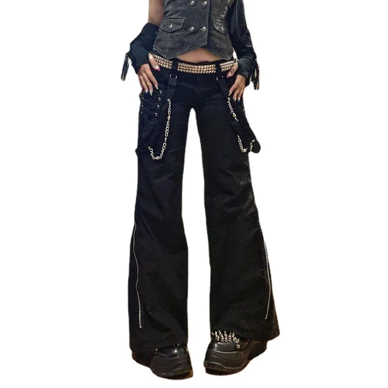 Брюки-карго женские, черные, широкие, с цепочкой, в стиле гот-Молл