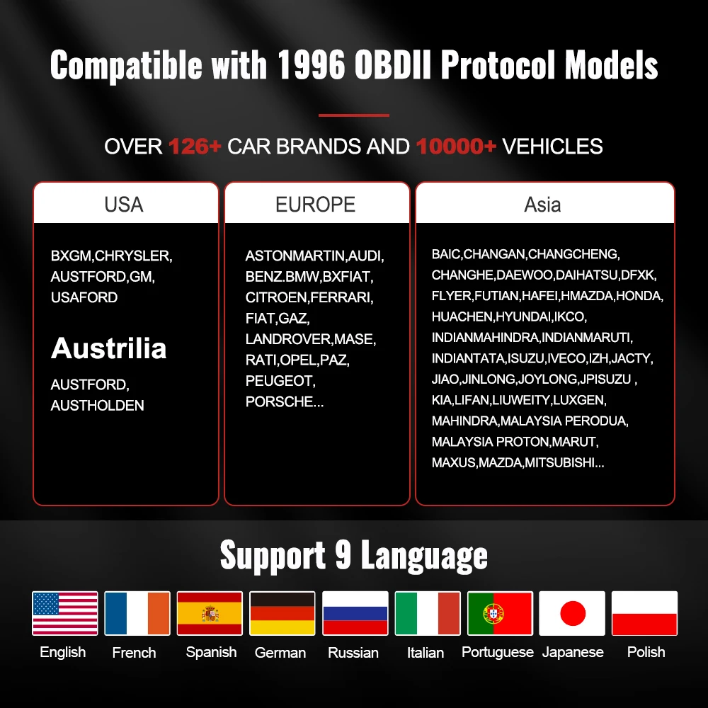 4. Поддержка 9 языков, 126 автомобильных брендов и 1000 автомобилей.