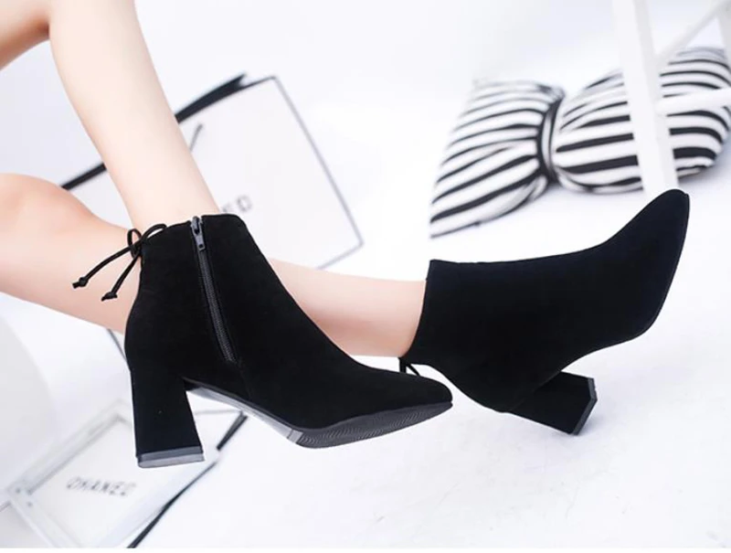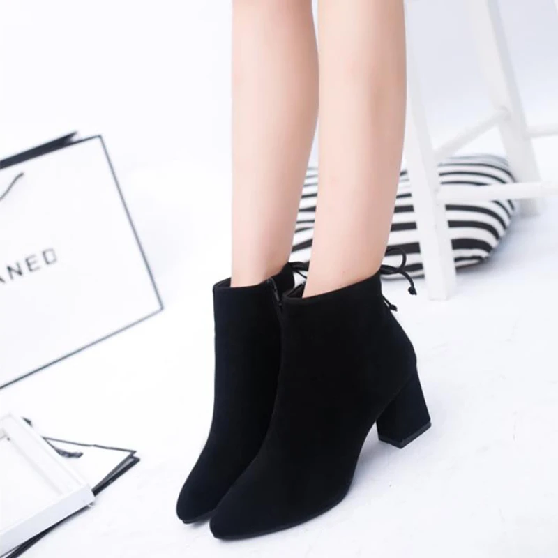 Женские ботильоны на толстом высоком каблуке, однотонные Зимние ботильоны на молнии сзади, с острым носком, в британском стиле