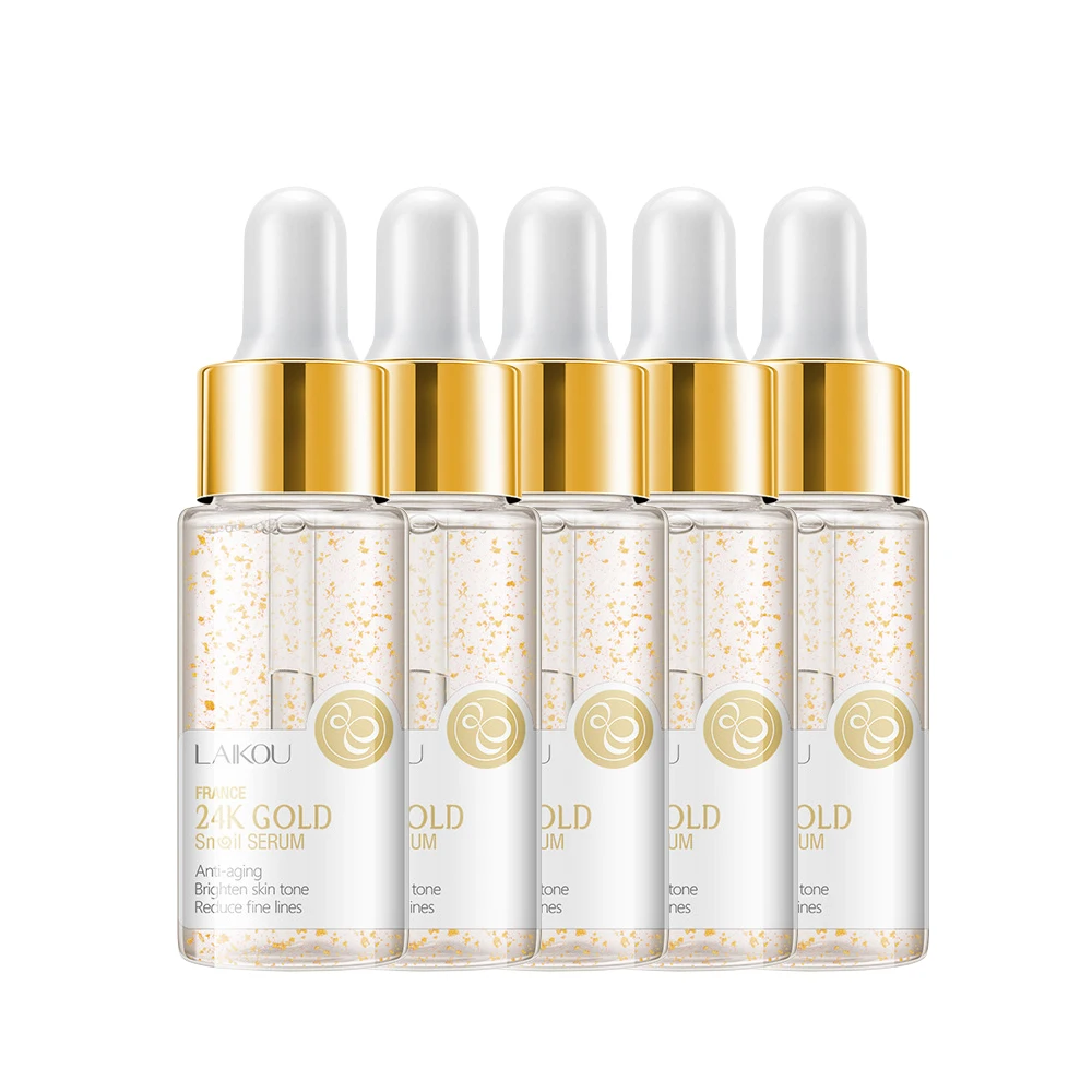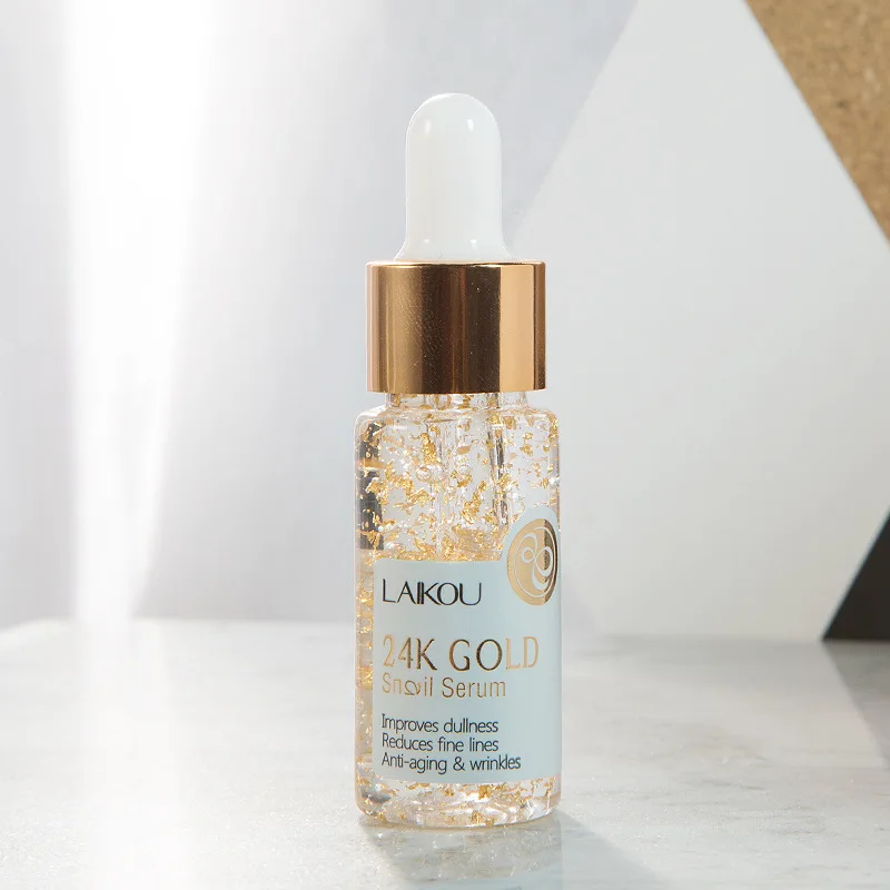LAIKOU Франция 24K Золотая сыворотка улитки содержит фильтрат секреции улитки и Ниацинамид, которые могут обеспечить влагу и питательные вещества. Он может эффективно уменьшить грубые поры, восстановить сухую и свободную кожу, сделать вашу кожу сияющей и яркой.