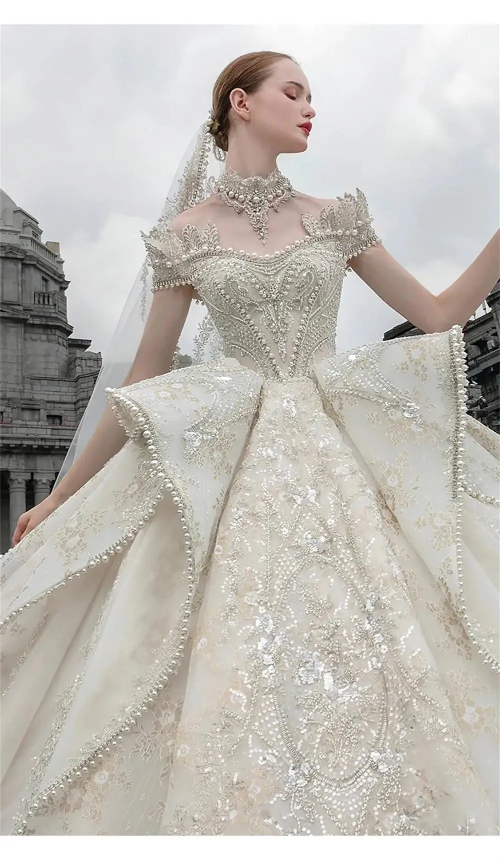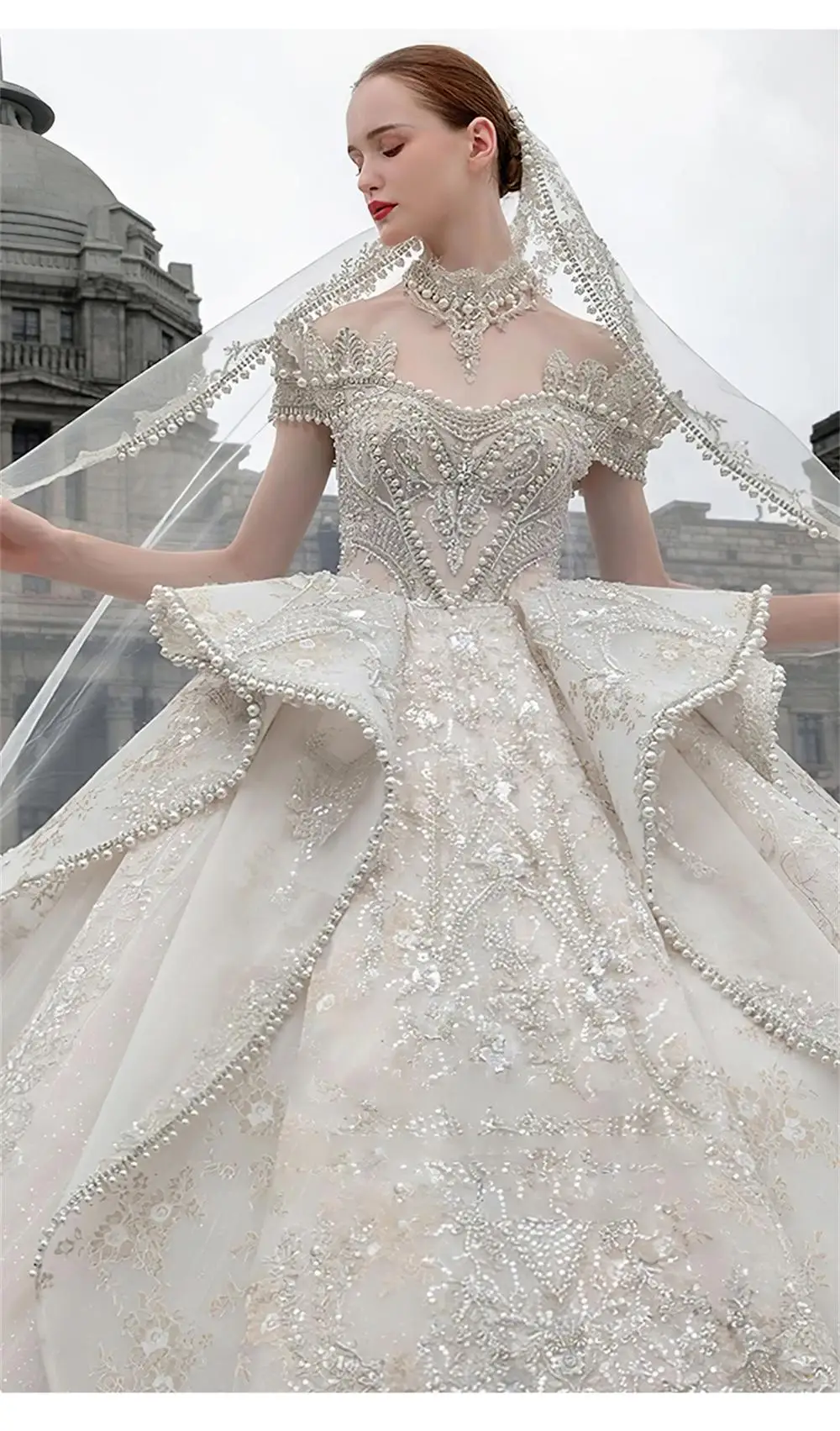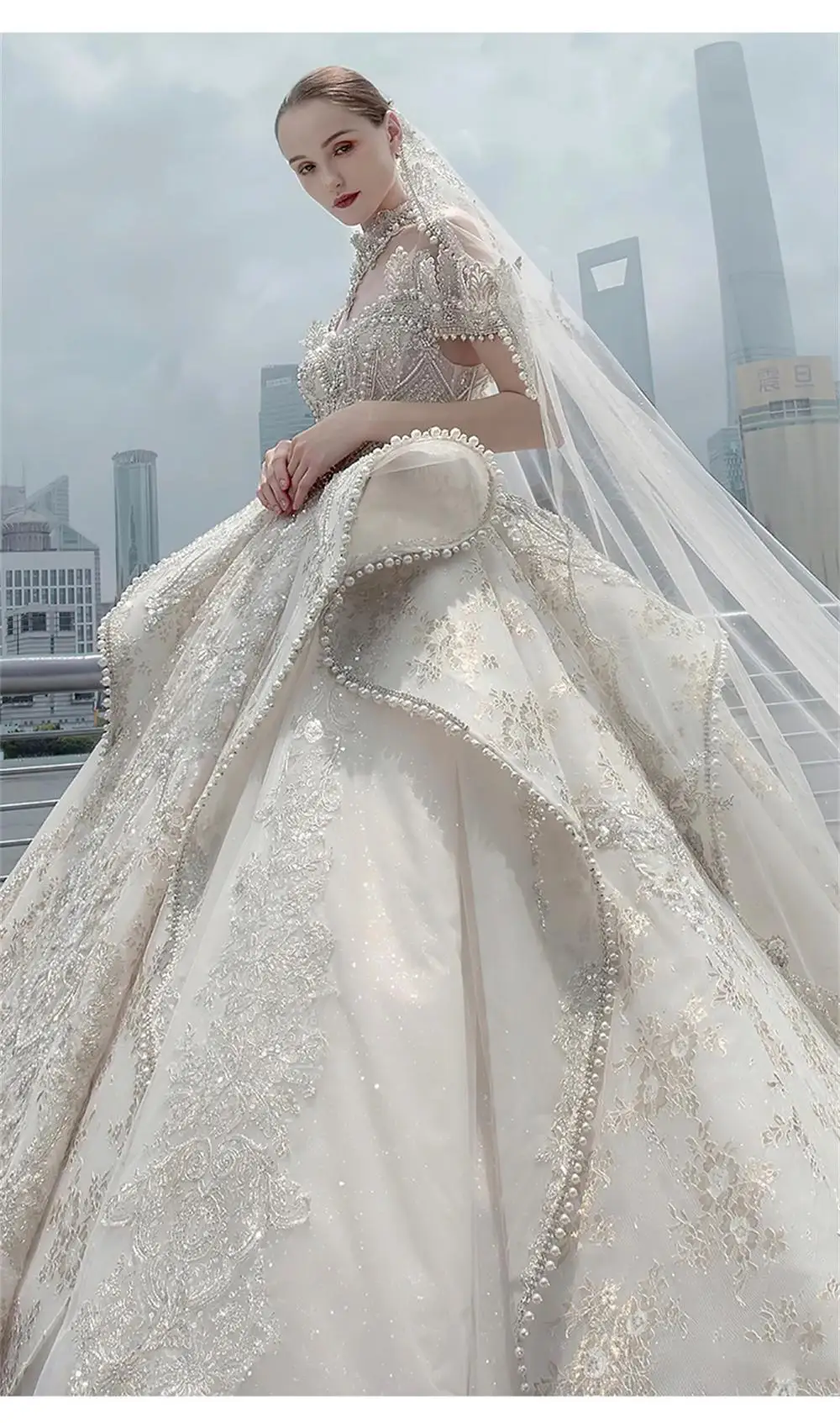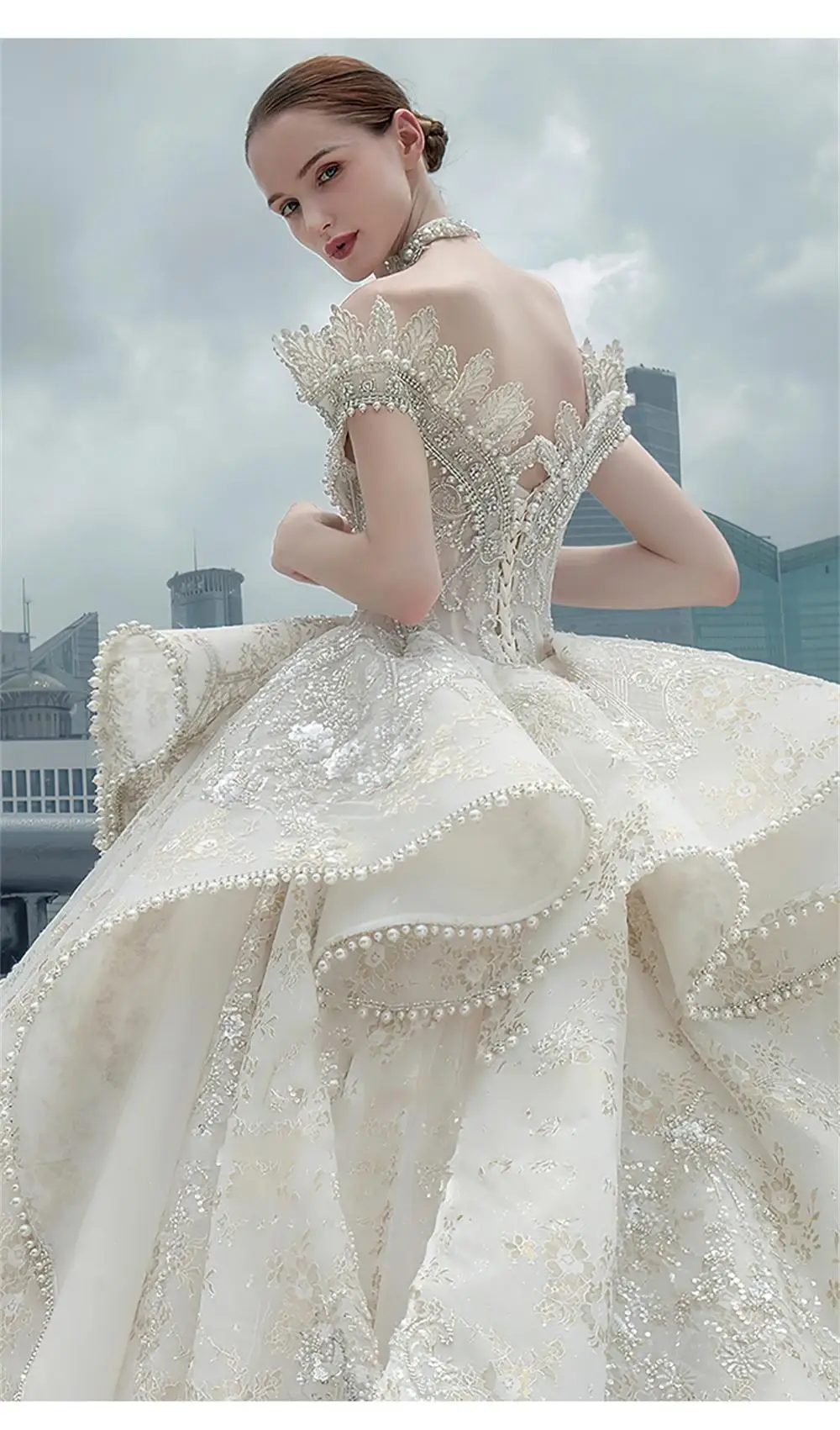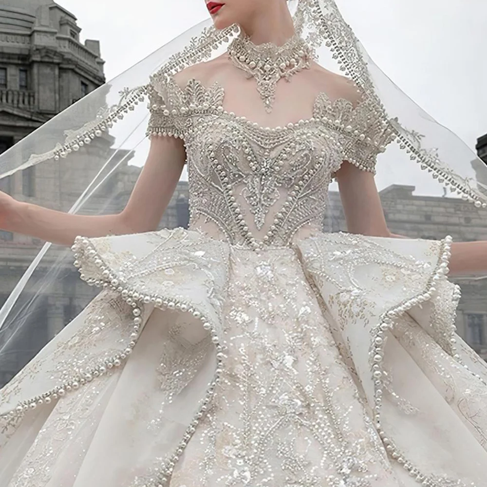 Роскошное Кружевное Свадебное бальное платье Dioflyusa с большим хвостом, серебро 2021 пробы, вырез лодочкой, винтажное свадебное платье с бисером и блестками