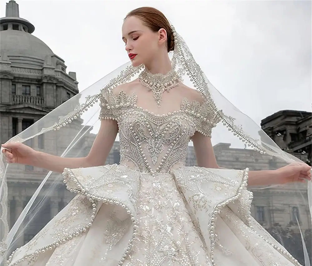 Ткань свадебного платьяТонкий шифон, отделанный бисером