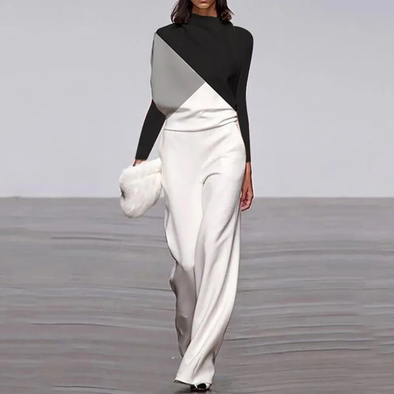 Женский комбинезон с длинным рукавом, элегантный комбинезон в вечерние ле пэчворк, винтажный однотонный комбинезон с широкими штанинами, Свободный Повседневный Комбинезон для весны и лета