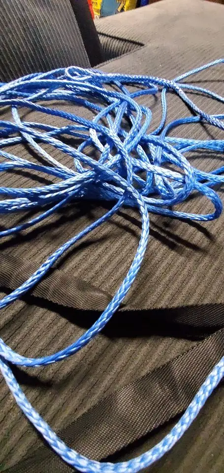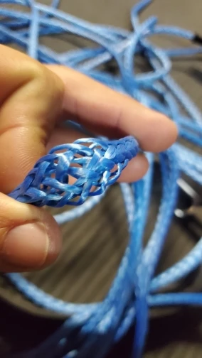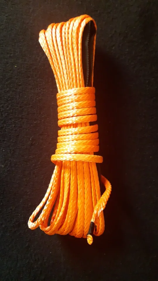 perfect rope is looklike a dynema . a pvc tube black will protect the rope from any damage but also great rope really happy for the purchase . dont expect a perfectly round shape because is pre stretched but will not make mechanical spinning. the size is perfect it is 4m by 6m because the stretched for strength . all rope like this hare like thet measurements . definitely strong no issues is coated also is pree stretched so it fell really firm tide and is look like hard but because is pree stretched and looks really strong . i reccomend for any heavy duty i use for kiteboarding . you can buy a pvc tube and covered as mono line for protection amd use 1 line only. for kiteboarding i will use with out pvc and make twin line