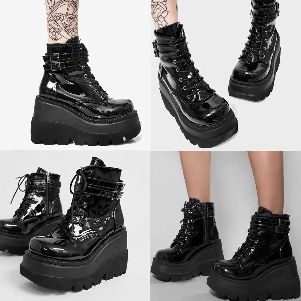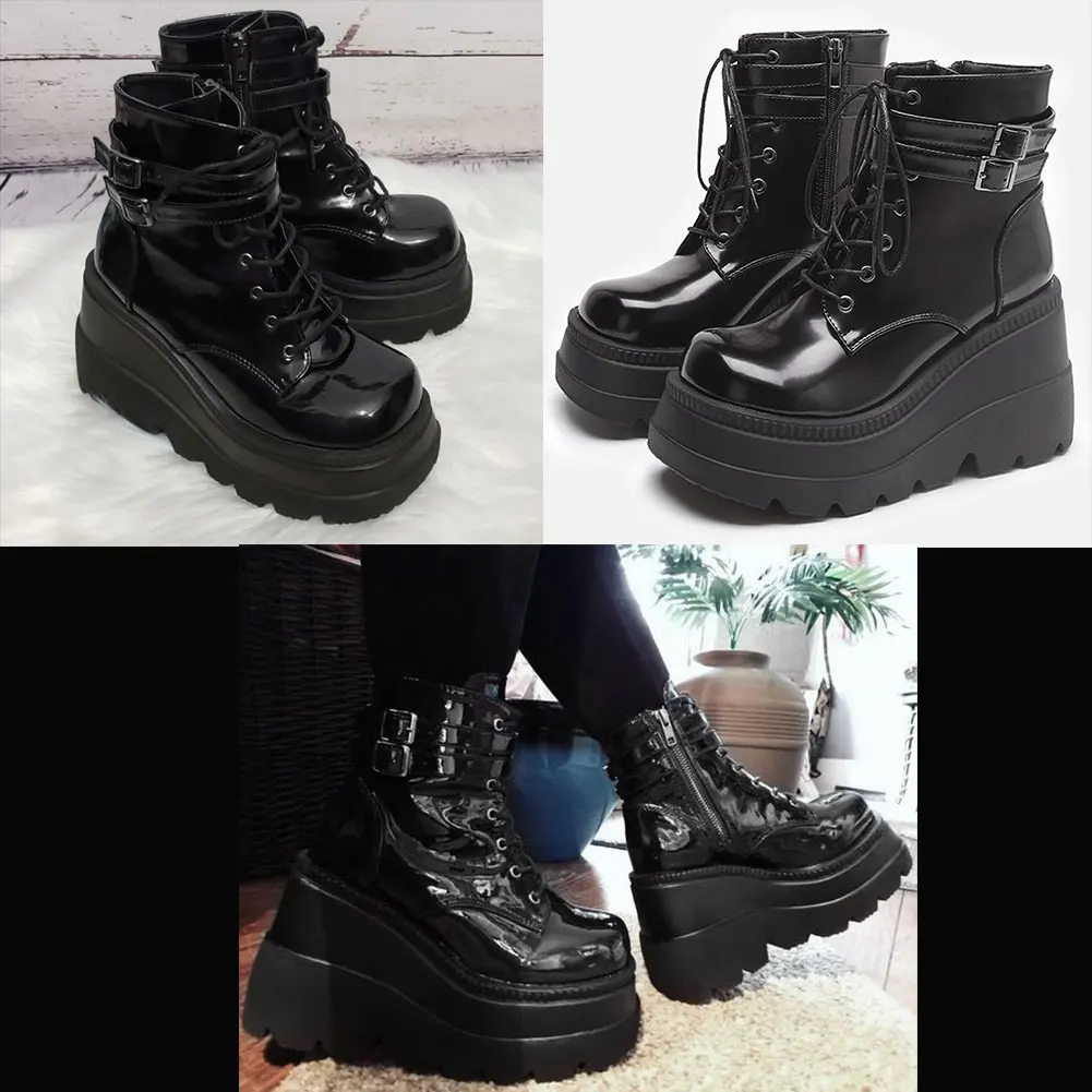 Женские ботильоны на танкетке, Черные ботильоны на высоком каблуке, в готическом стиле, большие размеры до 43, Осень-зима