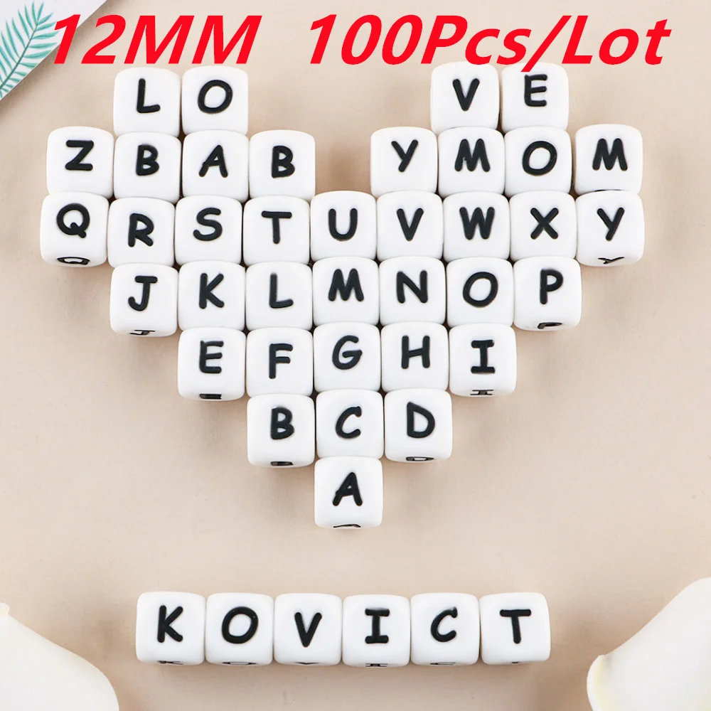 100 шт., силиконовые бусины в виде букв английского алфавита, 12 мм