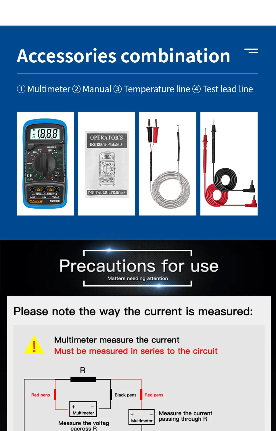 Особенности:3 1/2 цифровой ЖК-экран, максимальное значение дисплея 1999.Мультиметр оснащен четким, легко читаемым ЖК-дисплеем с белой задней подсветкой.Портативный и компактный дизайн.Хранение данных.Отображение символа низкого напряжения.Фон функция светового сигнала.Защита от перегрузки защиты Н.Проходят что измерения были сделаны вручную.Диода: ДаAudion: ДаСквозное измерение: даХранение данных: ДаФоновый свет: ДаМаксимальный дисплей: 1999 Спецификация:D C напряжение: 200 мВ-plus плюс или минус 0.5%Напряжение переменного тока: 200-600 в плюс или минус 1.0%Ток D C: 2 м-20 м-200 м-10 А + 1.8%Сопротивление: 200-2-20k до 200k, 2 км Ω плюс или минус 1.0%Измерение температуры: термопара Ktype, - 20 ℃ ~ 1300 ℃ (+ / - 3%)Измерение триода: (PNP/NPN Triode hFE)Измерение диода: ДаPass) транзисторов есть бесконтактная проверка напряжения переменного токаВходное сопротивление: 1 м ΩЭлектрическая бассейн элемент питания: 9V, 6F22 (батарея не входит в комплект поставки)Максимальный дисплей: 1999 (3 полужидкокристаллических дисплея)Размер дисплея: 45x18 мм Посылка включает в себя:1 x Цифровой мультиметр ANENG AN8205C (батарея в комплект не входит)2 х пара электронный зондРуководство пользователя (1 шт.)