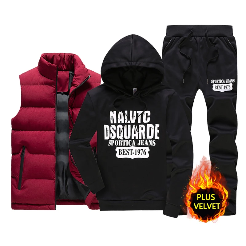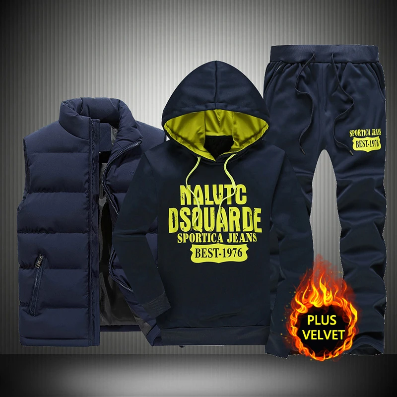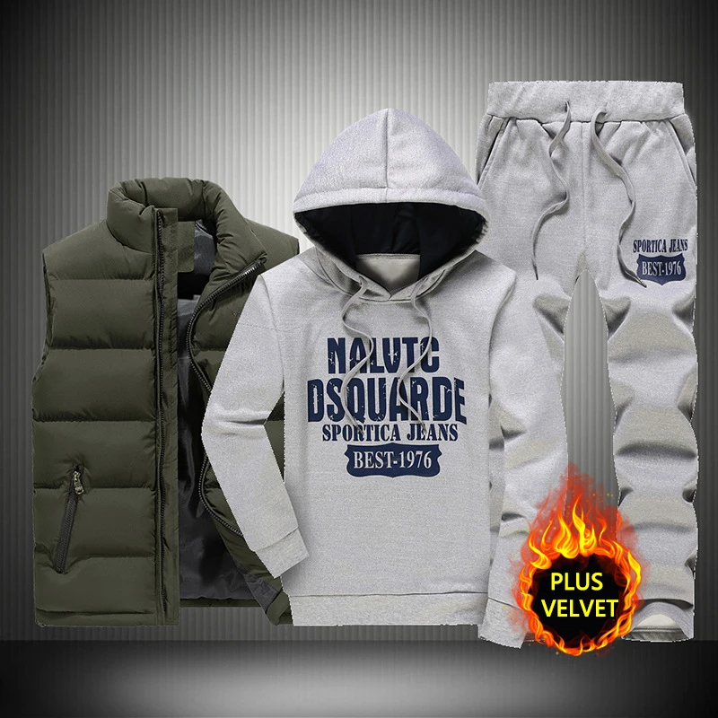 Мужской спортивный костюм из 3-х предметов, теплый жилет и толстовка с капюшоном и бархатные штаны, облегающий спортивный костюм, 2021