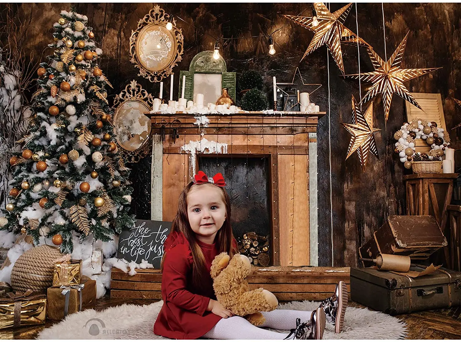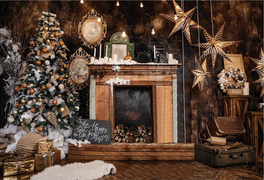 Рождественский фон для фотосъемки коричневый деревянный настенный камин рождевечерние елка для детей семейный винтажный Декор для комнаты зимний фон