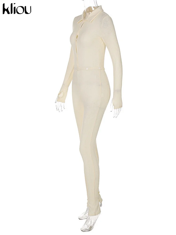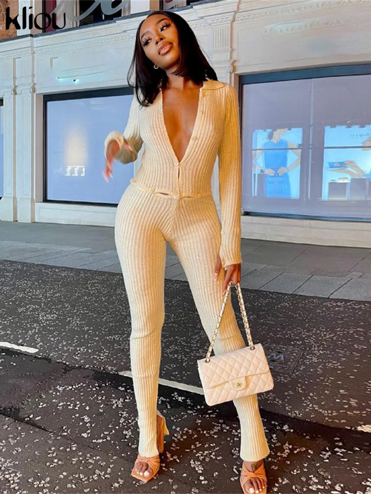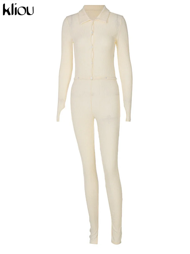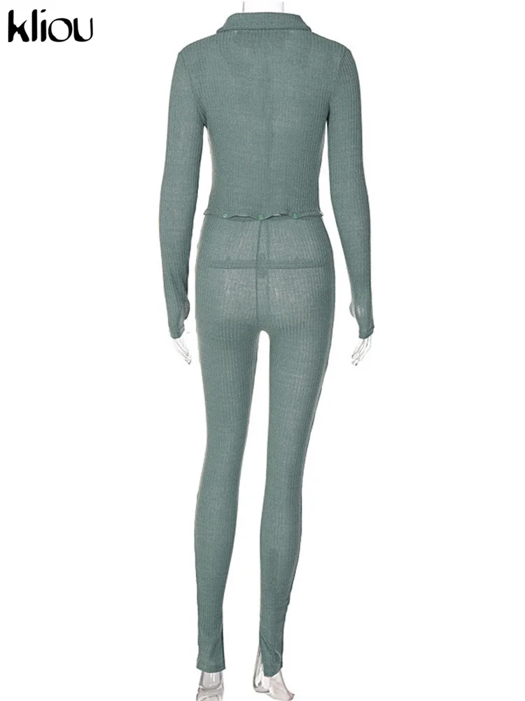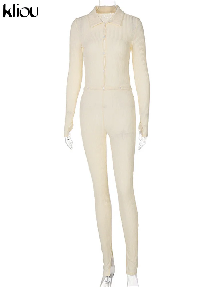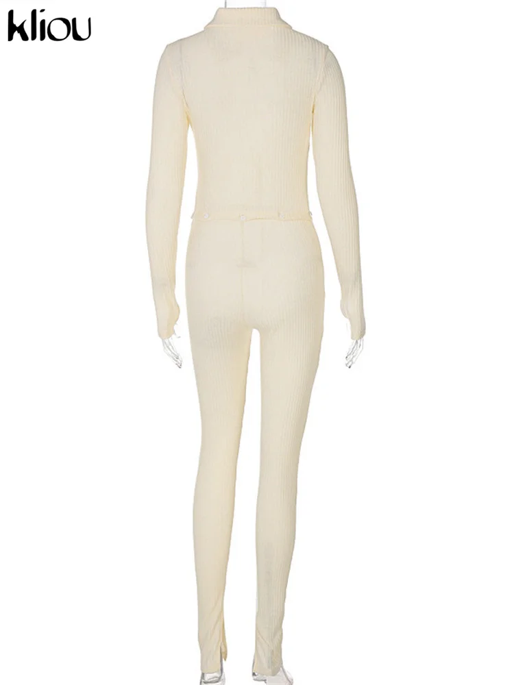 Женский комплект из двух предметов Kliou, Осенний однотонный однобортный Топ в сдержанном стиле + спортивные штаны, костюм с имитацией комбинезона