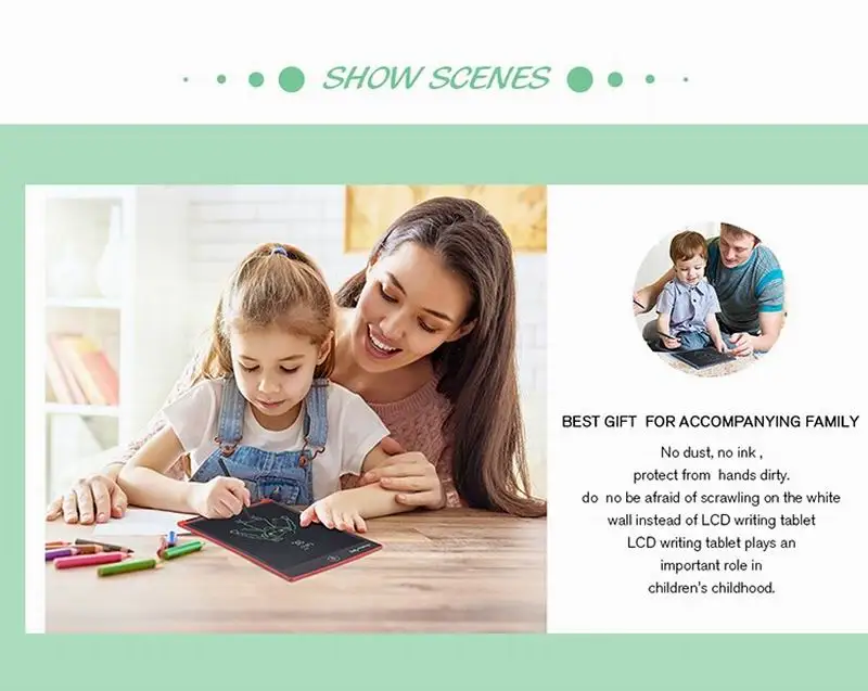 1. Защита глаз и безопасность для детей: ЖК-планшет оснащен новейшей технологией чувствительной к давлению ЖК-дисплея. Экран панели для рисования полностью безопасен с помощью теста: без бликов, без излучения, без чернил, без пыли, бумажного видения, которые могут защитить зрение ваших детей и держать их подальше от химических пигментов и пыли, которые будут стимулировать их кожу и легкие.