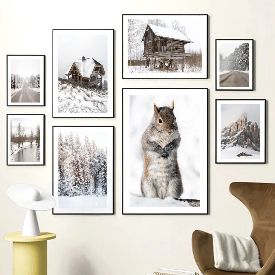 Зимний снег горная дорога дом белка стены искусства холст картина скандинавские плакаты и принты настенные картины для декора гостиной