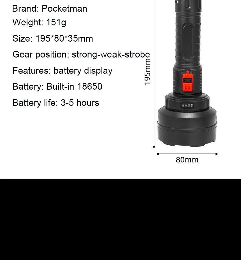 Упаковочные коробкиСпособ зарядки: зарядка через USBВес: 151 гРазмер: 195*80*35 ммПоложение шестерни: сильный-слабый-стробоскопХарактеристики: дисплей батареиАккумулятор: встроенный 18650Срок службы батареи: 3-5 часов