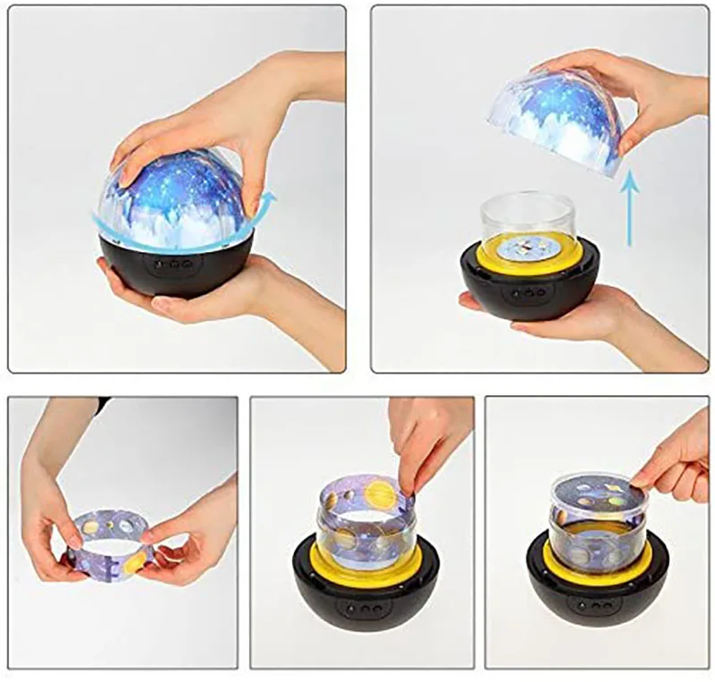 2. Пять фильмов --- Волшебная Вселенная, звезды, луна, океан, с днем рождения. Таким образом, красивый светильник будет проецироваться на потолок или стену. Нажмите и удерживайте кнопку B в течение 2 секунд, и светильник будет вращаться.