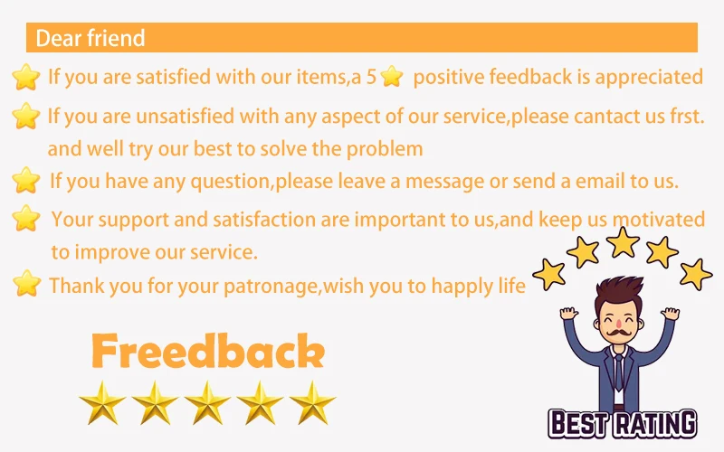 A: Уважаемые покупатели, мы ценим ваш бизнес, если вы удовлетворены нашими продуктами и обслуживанием, пожалуйста, оцените детали транзакции (подробные оценки продавца) на aliexpress с"Идеальный 5 звезд"И оставьте.