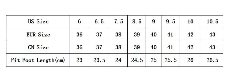 Размеры 5 = Китай 35 подойдет 22,5 смРазмер 6 = Китай 36 подходит 23 смРазмеры 6,5 = Китайский 37 подходит 23,5 смРазмер 7,5 = Китай 38 подходит 24 смРазмеры 8,5 = 39 подходит 24,5 смРазмер 9 = Китай 40 подходит 25 смSize9.5 = Китай 41fit 25,5 смРазмер 10 = Китай 42fit 26 смSize10.5 = Китай 43fit 26,5 смПожалуйста, выберите правильный размер в соответствии с нашей деталью размеров.Не ориентируйтесь на размер вашей страны. Или легко выбрать неправильный размер.Рекомендации по размеру: если у вас широкая или Толстая стопа, мы советуем выбрать на один размер больше, чем на самом деле.Если вы все еще не можете выбрать размер, вы можете связаться с нашей службой поддержки клиентов, прежде чем размещать заказ.