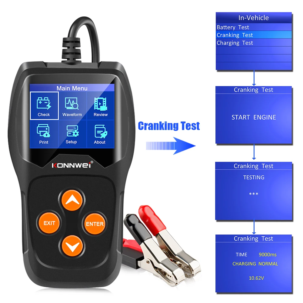 KONNWEI KW600 в Основном предназначен для анализа здорового состояния батареи, расчета фактического холодного тока, мощности батареи и степени старения, обеспечивая надежные доказательства анализа для тестирования и обслуживания батареи. KW600 предостерегает пользователей заменить батарею заранее, когда батарея стареет 1. Определение состояния батареи или замена 2. Проверьте емкость батареи-Ток холодного запуска ампер (CCA), DIN, NL и IEC информация относительно номинальности батареи. 3. Проверьте значение внутреннего сопротивления (Ом) 4. Отображение срока службы батареи в процентном соотношении (%) 5. Тест на проворот коленвала батареи, испытание нагрузки 6. Тест на зарядку аккумулятора, Пульсация 7. Графики мониторинга и обзора напряжения в реальном времени 8. Все результаты тестирования хранение и обзор 9. Печать/загрузка всех результатов тестирования и отчет о батарее на ПК для глубокого анализа. 10. Обновление в режиме онлайн бесплатно
