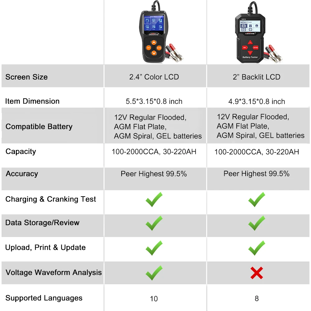 12V Battery Tester rangeCCA 100- 2000 CCA, 30- 220AH